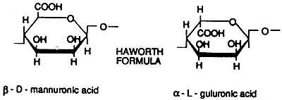 When examining the Haworth formula, it can be observed that the two acid residues involve epimerization at C-5. The only difference is the occurence of the linkage C-5 - C-6, above or below the medium plane of the ring. The bulkiness and the interactions, due to the acid function at C-6, dictate the conformation of the ring and involve the equatorial position of the acid function. The 3-D-mannuronic acid unit adopts always the C conformation and α-L-guluronic acid residue the C conformation.