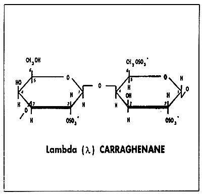The macromolecules of the gelling carrageenans are not pure in κ or ι but are present as hybrids. There is always a small part of ι in κ fraction and vice versa. In addition. in the macromolecule. other units can be found. in particular μ (mu) and ν (nu) carrageenans.