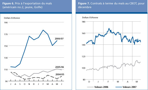Malgré la récolte mondiale record qui est attendue cette année, les cours mondiaux des céréales secondaires resteront probablement élevés pendant la campagne 2007/2008. Le maïs jaune des États-Unis (américain no. 2 Golfe, f.o.b) était coté en moyenne 159 dollars E.-U. la tonne en mai, soit une augmentation de 9 dollars E.-U. la tonne par rapport à avril et 48 dollars E.-U. de plus qu'à la même époque un an auparavant. Les récoltes record rentrées en Argentine et au Brésil ont contribué à faire baisser les prix entre février et avril. Toutefois, étant donné que la demande globale de maïs reste robuste et que les États-Unis utilisent de vastes disponibilités pour la production intérieure d'éthanol, la possibilité de nouvelles baisses des prix pendant la nouvelle campagne s'estompe. La perspective que les prix restent fermes est confirmée par les faits nouveaux sur les marchés à terme. À la fin mai, les contrats pour le maïs portant échéance en décembre se négociaient au Chicago Board of Trade (CBOT) à 145 dollars E.-U. la tonne, soit quelque 35 dollars E.-U. de plus qu'à la même époque en 2006.