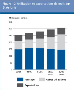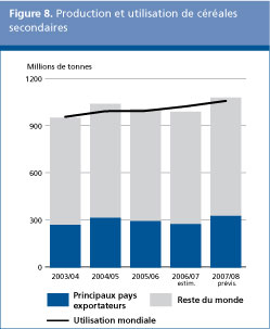 Selon les prévisions, l'utilisation mondiale de céréales secondaires en 2007/2008 augmenterait, pour passer à environ 1058 millions de tonnes, ce qui est à la fois 3,4 pour cent de plus que le niveau estimatif pour 2006/2007 et au-dessus de la moyenne sur dix ans. L'utilisation totale dans le secteur fourrager, qui représente normalement le gros de l'utilisation de céréales secondaires, devrait s'élever à 624 millions de tonnes, soit un peu moins que le niveau estimatif pour 2006/2007. Les prix élevés pratiqués sur la plupart des marchés et la moindre utilisation du maïs dans le secteur de l'alimentation animale qui est attendue aux États-Unis comptent parmi les principaux facteurs à l'origine de ce recul. En revanche, une vaste expansion de l'utilisation industrielle des céréales secondaires se profile, sous l'effet essentiellement de la forte demande dans le secteur de l'éthanol, notamment aux États-Unis où, selon les dernières prévisions officielles du Département de l'agriculture des États-Unis (mai 2007), quelque 86 millions de tonnes de maïs seront utilisées pour produire de l'éthanol en 2007/2008. Cela représenterait une augmentation spectaculaire de 30 millions de tonnes, soit près de 60 pour cent, par rapport à l'utilisation déjà record enregistrée en 2006/2007. La consommation humaine de céréales secondaires devrait atteindre 183 millions de tonnes, soit à peine un pour cent de plus que pendant la campagne précédente. La plupart de cette augmentation devrait se constater dans plusieurs pays en développement d'Afrique australe et d'Amérique latine.