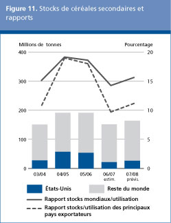 Les dernières prévisions de la FAO établissent la production mondiale de céréales secondaires de 2007 à 1 073 millions de tonnes, soit 9 pour cent de plus que l'an dernier et un volume record. Le gros de cette augmentation devrait concerner le maïs, qui représente environ 70 pour cent de la production totale de céréales secondaires et devrait atteindre en 2007 le niveau record de 770 millions de tonnes. Dans l'hémisphère Sud, les récoltes des campagnes principales de 2007 sont en cours ou déjà terminées. En Amérique du Sud, une récolte record de maïs est actuellement rentrée pour la campagne principale en Argentine, au Brésil et au Chili, suite à la progression des semis face à la forte demande pour la production d'éthanol et aux conditions de végétation favorables, qui ont permis des rendements exceptionnels. La récolte de la campagne secondaire au Brésil devrait aussi augmenter. En Afrique australe, toutefois, les perspectives sont moins favorables et selon les prévisions, la production totale devrait se situer un peu au-dessous du niveau inférieur à la moyenne enregistré l'an dernier. Dans l'hémisphère Nord, l'essentiel des cultures de maïs est désormais en terre, et une récolte plus importante est attendue dans tous les principaux pays producteurs. Toutefois, l'évolution de loin la plus importante constatée pour cette campagne est l'achèvement aux États-Unis des semis de maïs les plus étendus depuis 1944, principalement en réponse à la demande intérieure exceptionnellement forte pour la production d'éthanol à base de maïs.