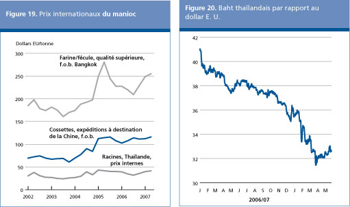 La reprise des cours internationaux des produits dérivés du manioc, qui a commencé début 2006, a été constante durant les quatre premiers mois de 2007. Les prix de la farine et de la fécule de manioc en provenance de Thaïlande (f.o.b. Bangkok), libellés en dollars E.-U., ont enregistré une hausse d’environ 16 pour cent par rapport à 2006 à la même période, tandis que les prix des cossettes de manioc en provenance de ce même pays (et destinés à la Chine) ont augmenté de près de 13 pour cent. Le renforcement de ces cours peut être en grande partie attribué à l’appréciation de la devise thaïlandaise par rapport au dollar E.-U., qui, par exemple, a progressé de 25 pour cent depuis le début de l’an dernier. Les cours des agglomérés destinées à l’Europe (f.o.b. Rotterdam) continuent d’être peu connus, ce qui montre le manque persistant d’intérêt sérieux pour les ingrédients d’aliments pour animaux à base de manioc sur le marché de l’UE. Les perspectives en ce qui concerne les prix du manioc pour le reste de l’année 2007 dépendront surtout du dynamisme de la demande en Asie de l’Est et du Sud-Est et du retour de l’UE sur la scène internationale, qui dépendra en dernier ressort de la compétitivité des cours des produits dérivés du manioc par rapport aux céréales de production nationale et importées.
