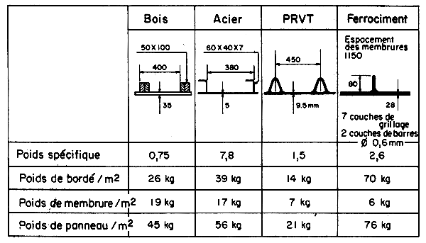Les tableaux 1 et 2 comparent quelques propriétés physiques et les prix par unité de poids du PRVT, du bois, de l'aluminium et de l'acier utilisés dans la construction navale. Le tableau 3 donne une comparaison des poids.