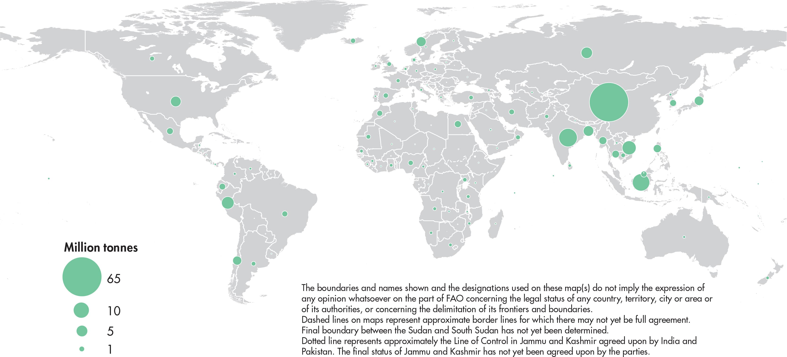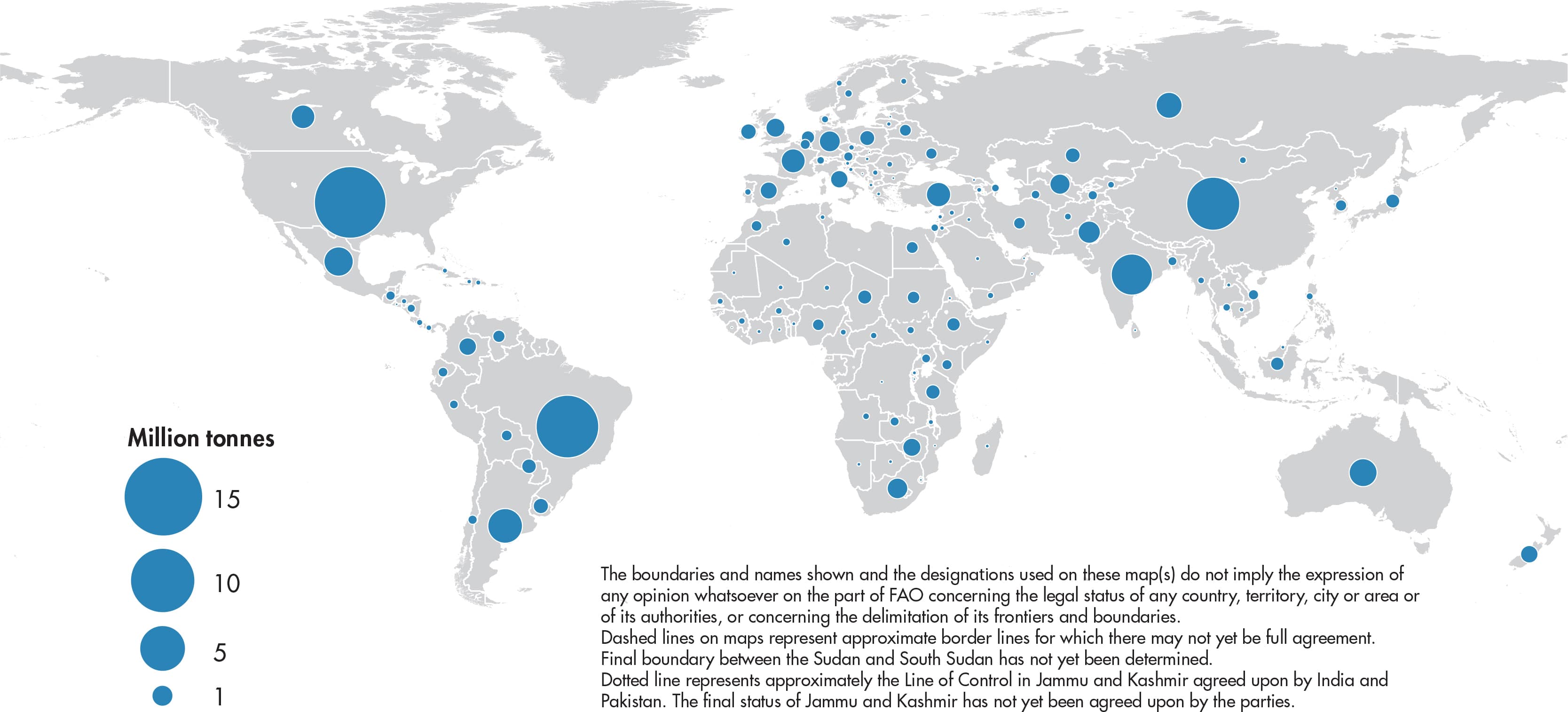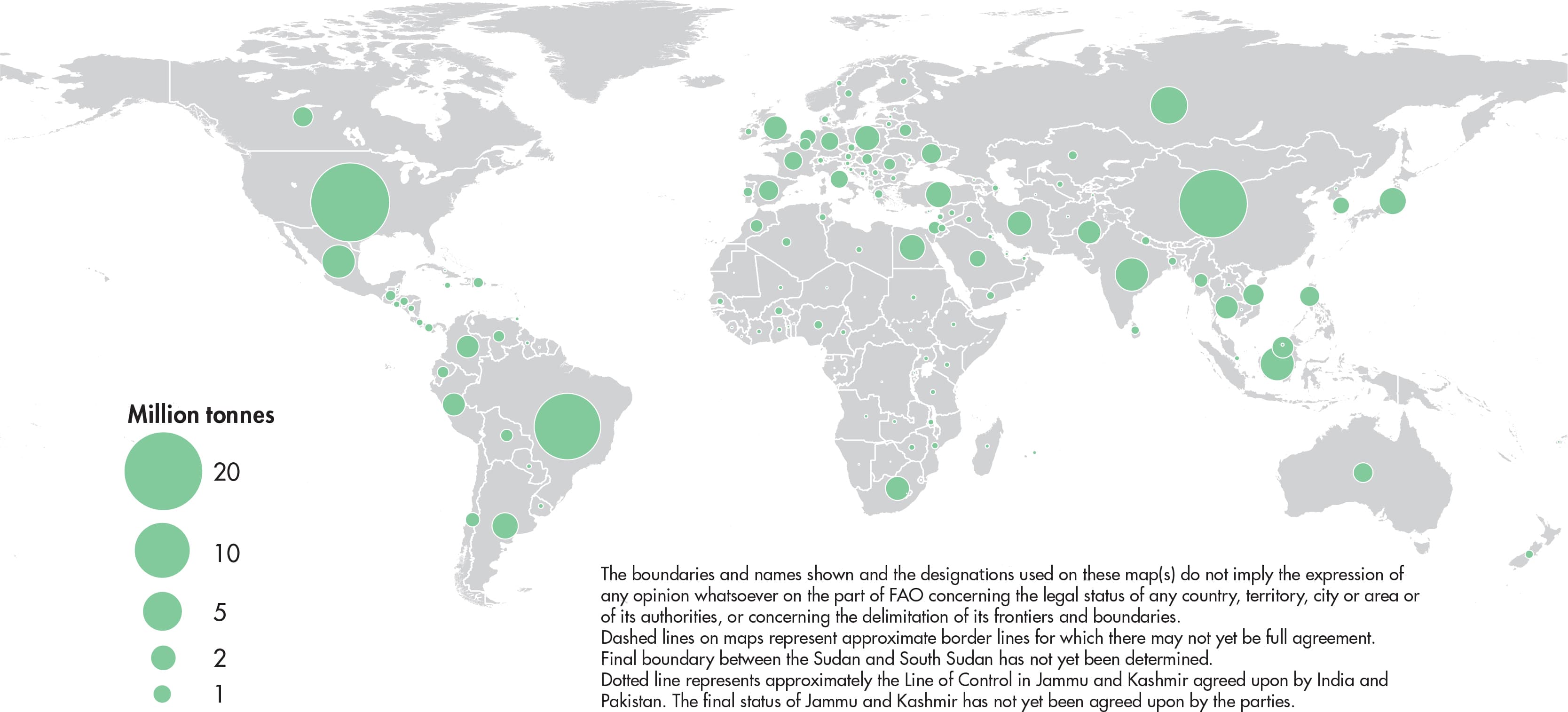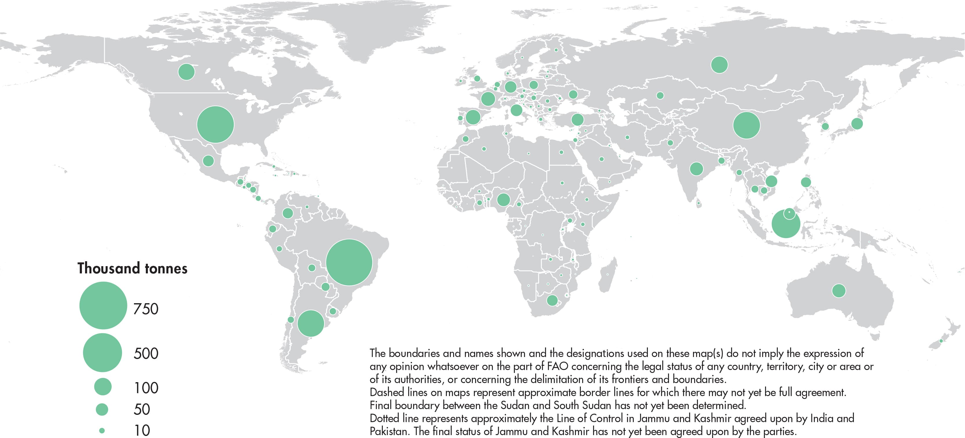 Figures relate to the total domestic production whether inside or outside the agricultural sector, i.e. they include non-commercial production and production from kitchen gardens. Unless otherwise indicated, production is reported at the farm level for crop and livestock products (i.e. in the case of crops, excluding harvesting losses) and in terms of live weight for fish items (i.e. the actual ex-water weight at time of catch). All data shown relate to total meat production from both commercial and farm slaughter. Data are expressed in terms of dressed carcass weight, excluding offal and slaughter fats. Production of beef and buffalo meat includes veal; mutton and goat meat includes meat from lambs and kids; and pig meat includes bacon and ham in fresh equivalent. Poultry meat includes meat from all domestic birds and refers, wherever possible, to ready-to-cook weight.