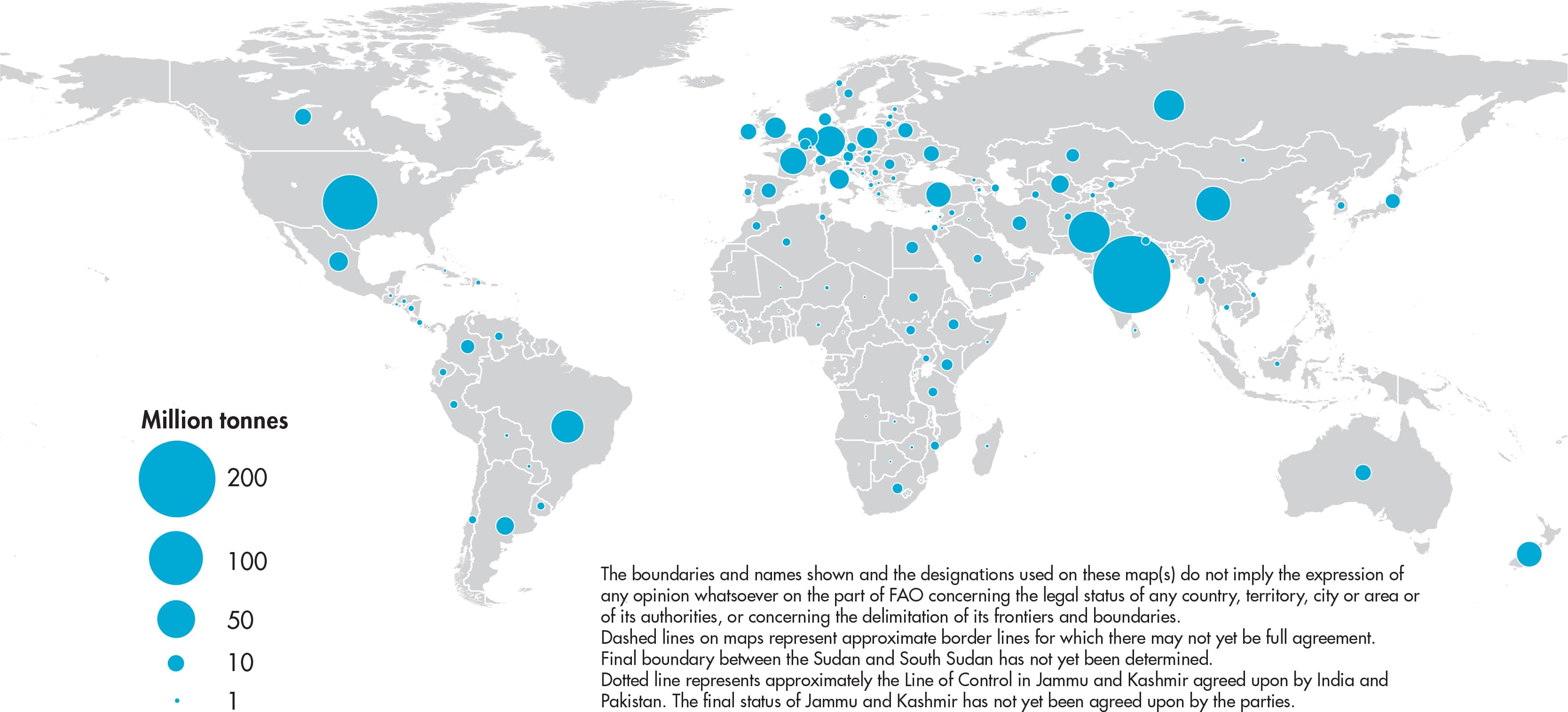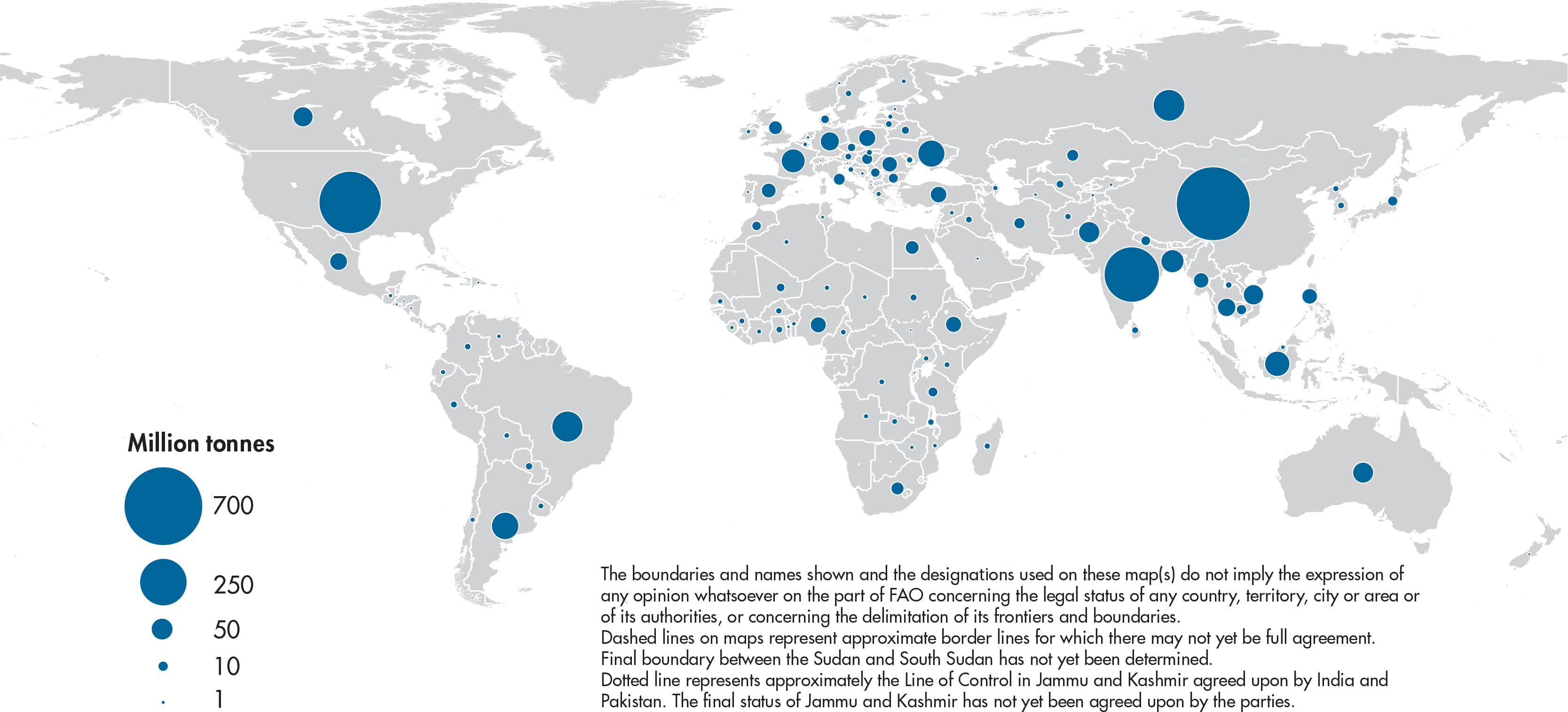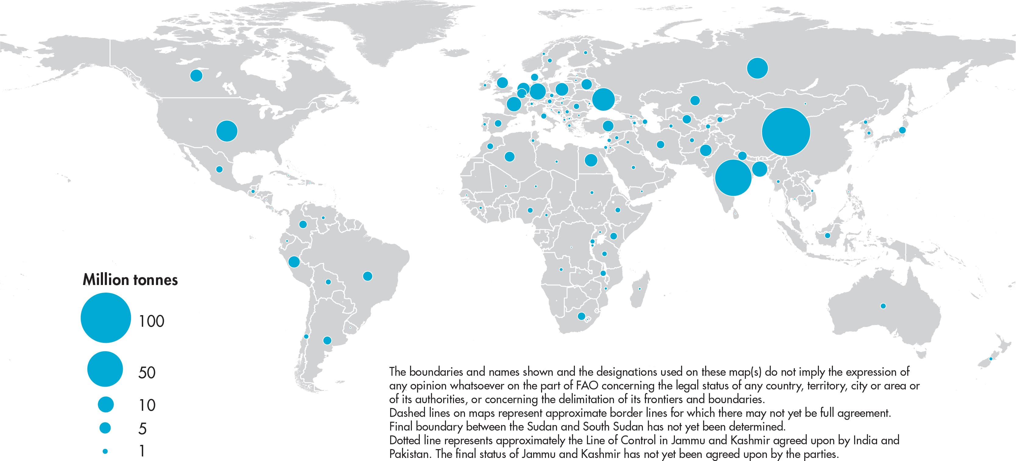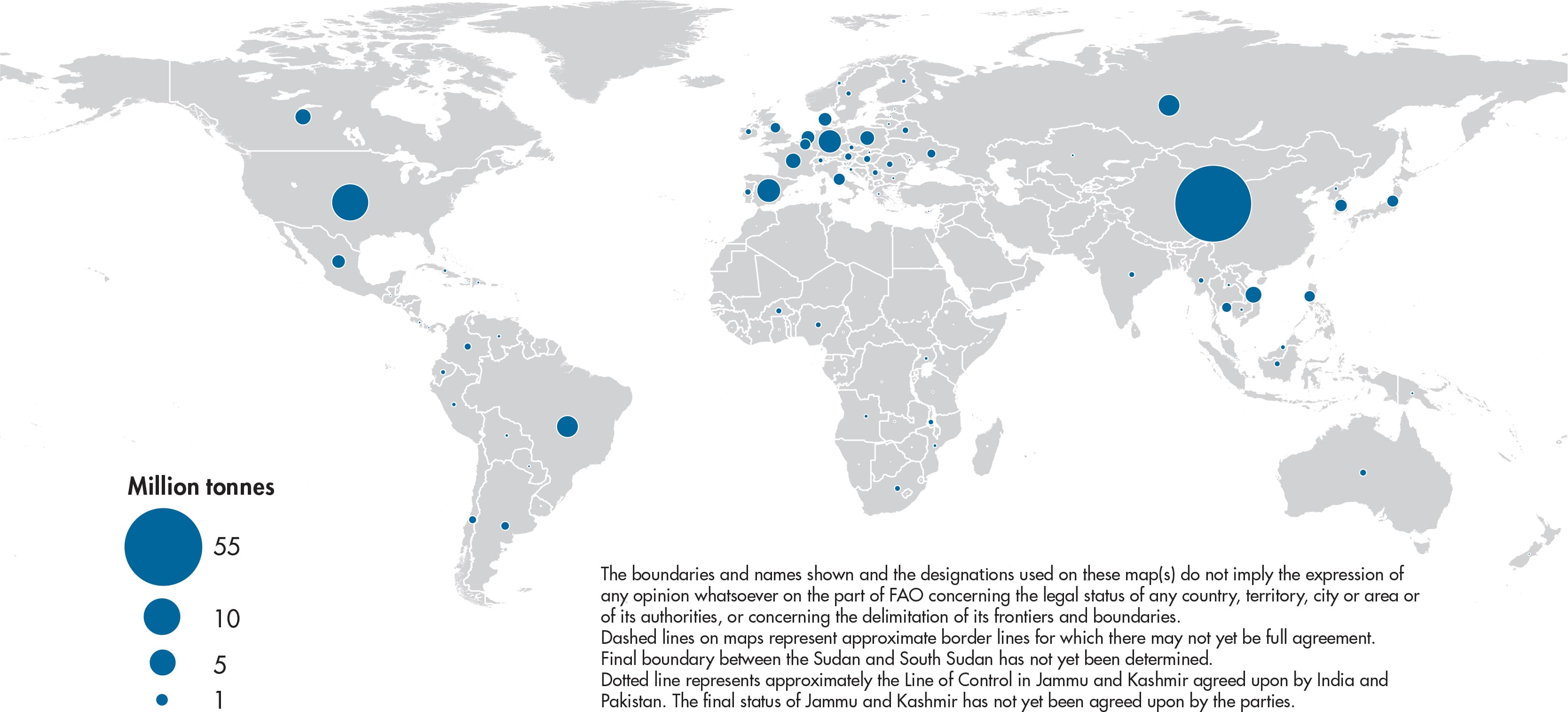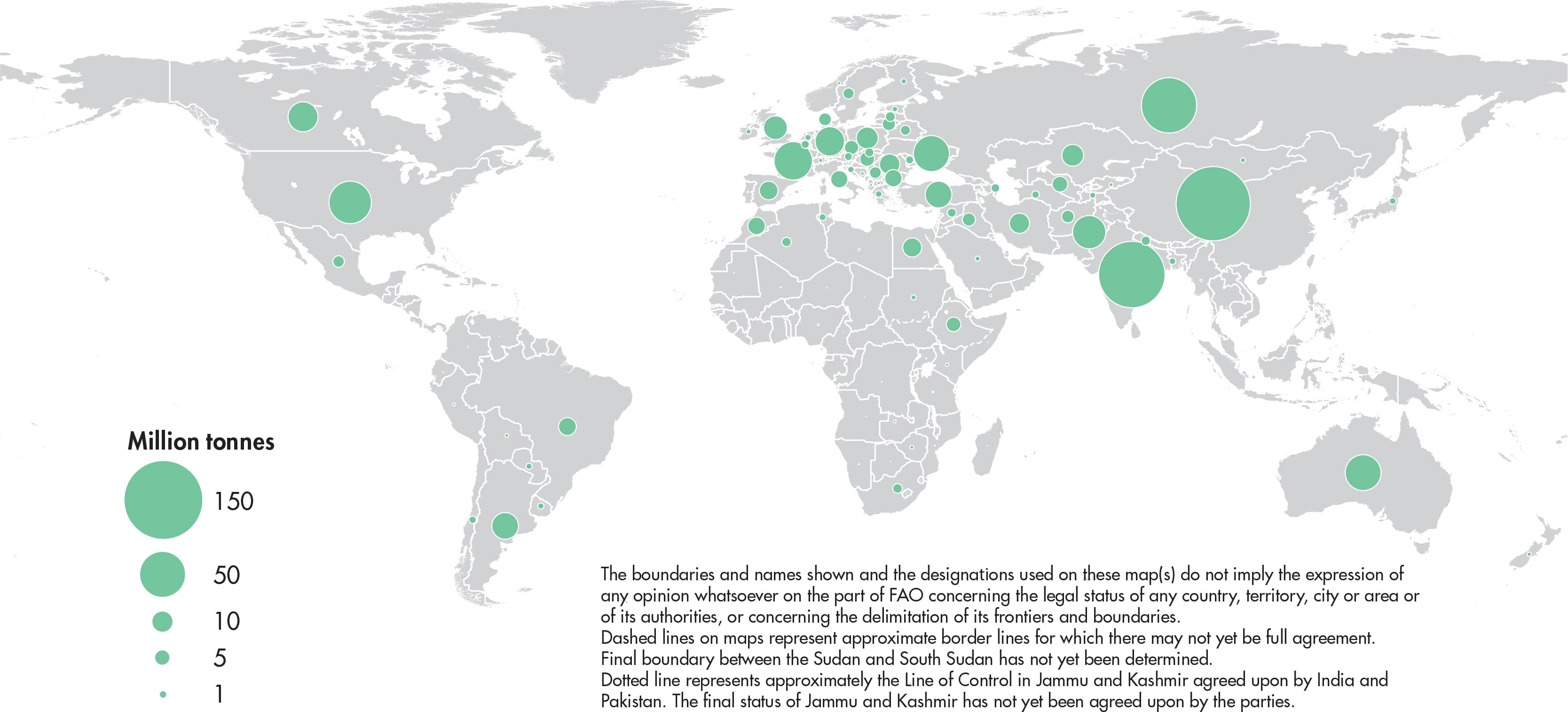Figures relate to the total domestic production whether inside or outside the agricultural sector, i.e. they include non-commercial production and production from kitchen gardens. Unless otherwise indicated, production is reported at the farm level for crop and livestock products (i.e. in the case of crops, excluding harvesting losses) and in terms of live weight for fish items (i.e. the actual ex-water weight at time of catch). All data shown relate to total meat production from both commercial and farm slaughter. Data are expressed in terms of dressed carcass weight, excluding offal and slaughter fats. Production of beef and buffalo meat includes veal; mutton and goat meat includes meat from lambs and kids; and pig meat includes bacon and ham in fresh equivalent. Poultry meat includes meat from all domestic birds and refers, wherever possible, to ready-to-cook weight.