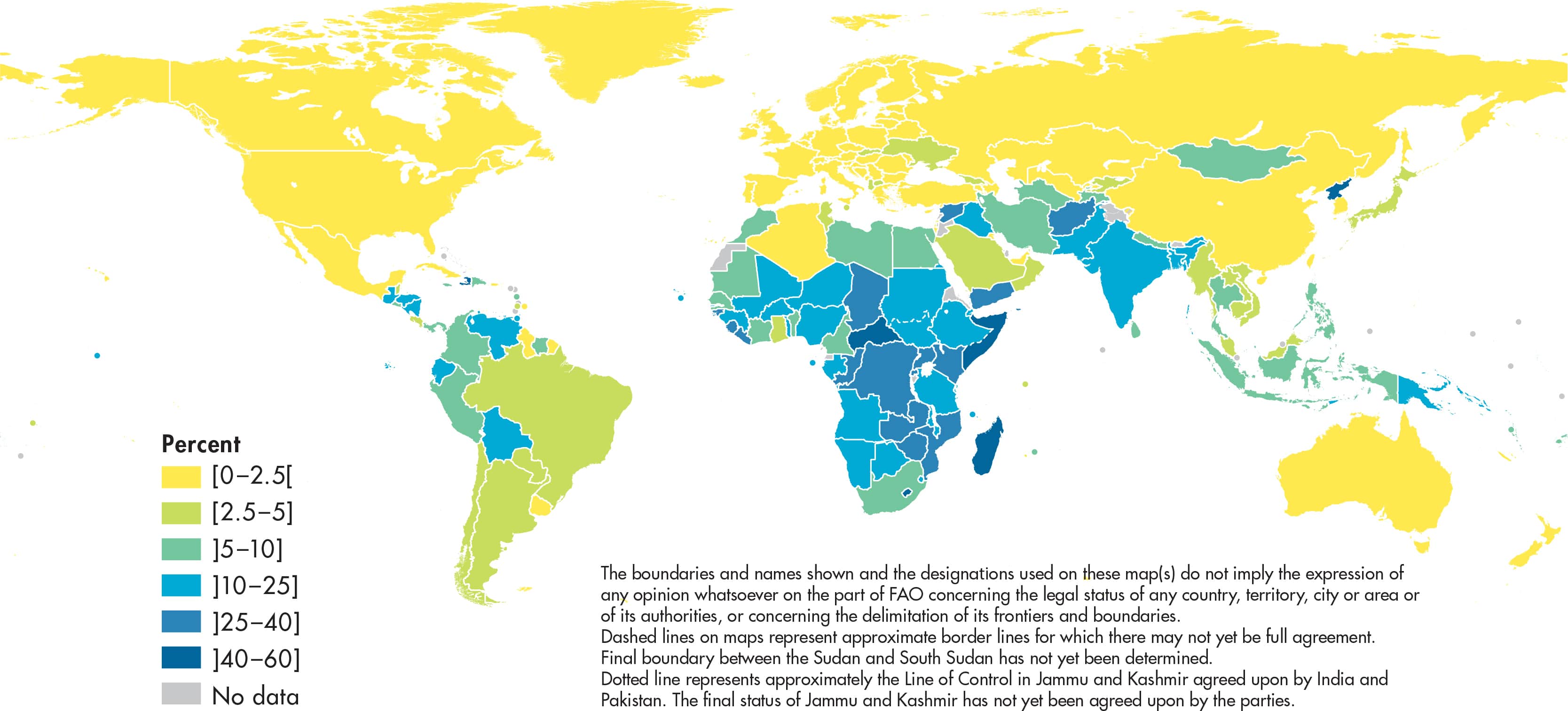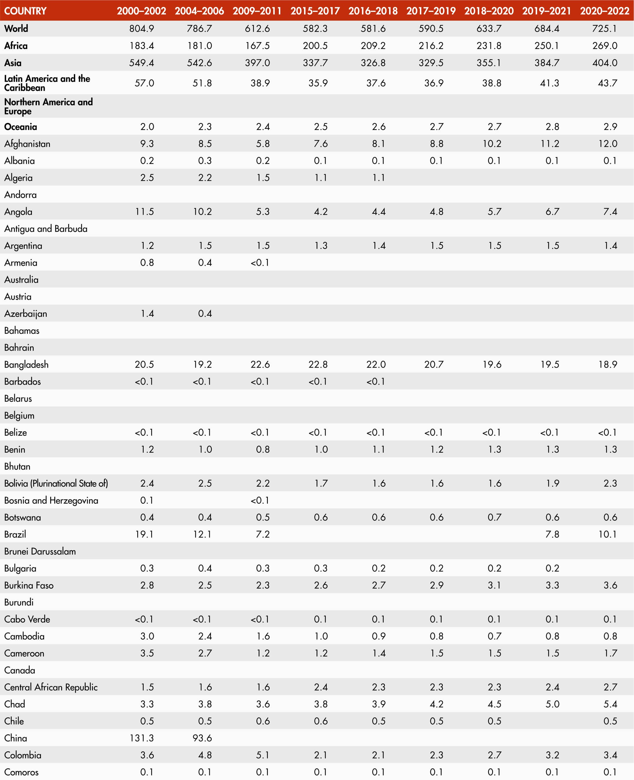 The number of people undernourished is obtained by multiplying estimates of the proportion of undernourished for each country by estimates of the total population. Undernourishment refers to the condition of people whose dietary energy consumption is continuously below a minimum dietary energy requirement for maintaining a healthy life and carrying out light physical activity.