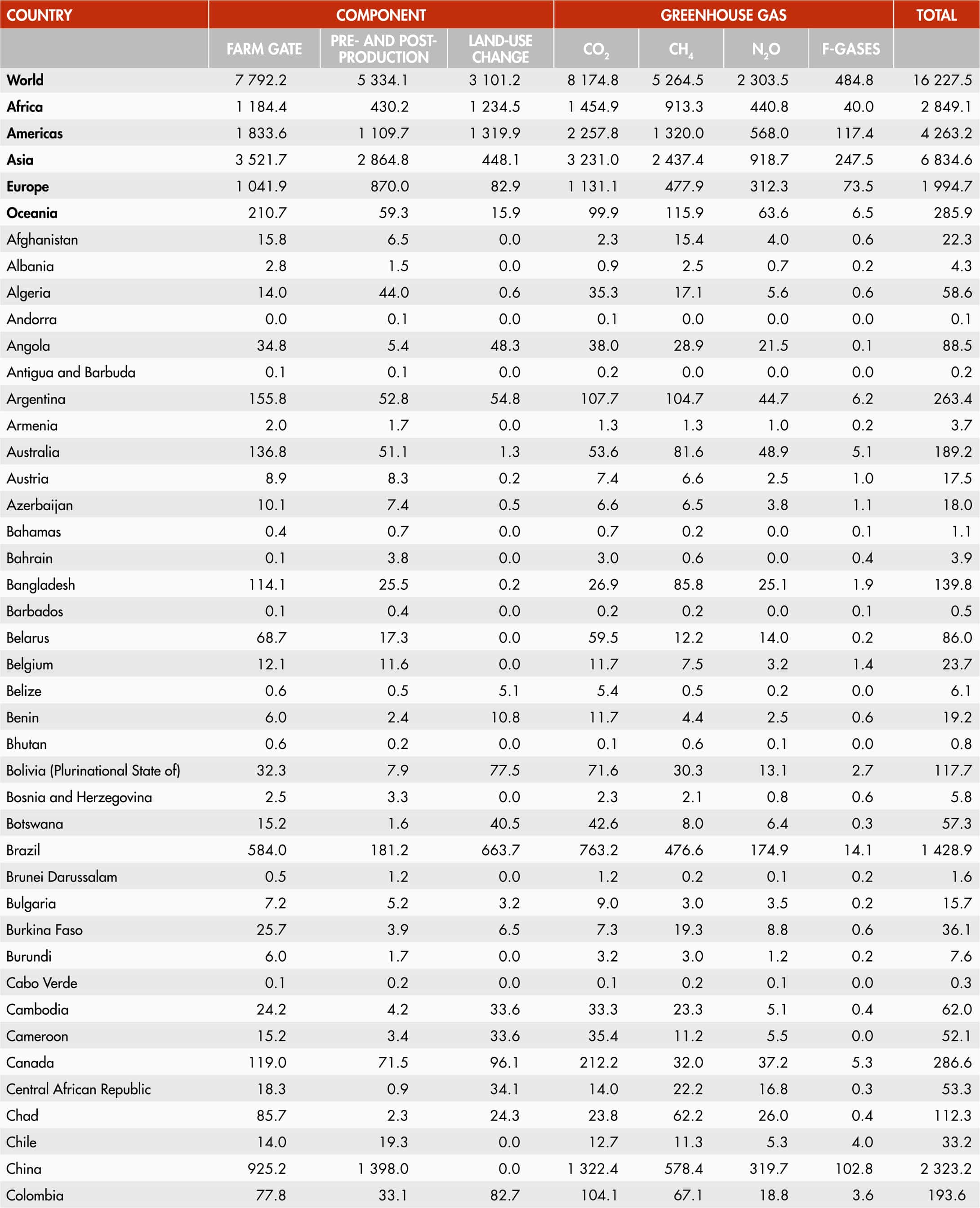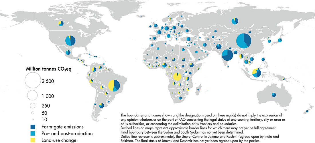 Greenhouse gas (GHG) emissions from agrifood systems are generated within the farm gate by crop and livestock production activities; from land-use change dynamics, linked for instance to deforestation and peatland degradation to make room for agriculture; and in pre- and post-production processes, such as food manufacturing, household consumption and disposal of food waste. Emissions, relevant to each process, consist of nitrous oxide (N2O); methane (CH4); carbon dioxide (CO2); and fluorinated gases (F-gases).