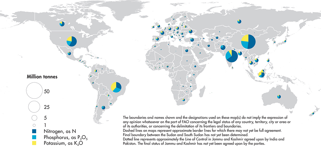The use of fertilizers refers to agricultural use of inorganic (mineral or chemical) fertilizers for the three main plant nutrients: nitrogen (N), phosphorus (expressed as P2O5) and potassium (expressed as K2O). It includes both straight fertilizers (those containing only one of the three primary plant nutrients) and compound fertilizers (those containing more than one of the three primary plant nutrients; they may be NP, NK, PK or NPK). Agricultural use refers to the use for crops, livestock, forestry, fisheries and aquaculture, excluding use for animal feed.