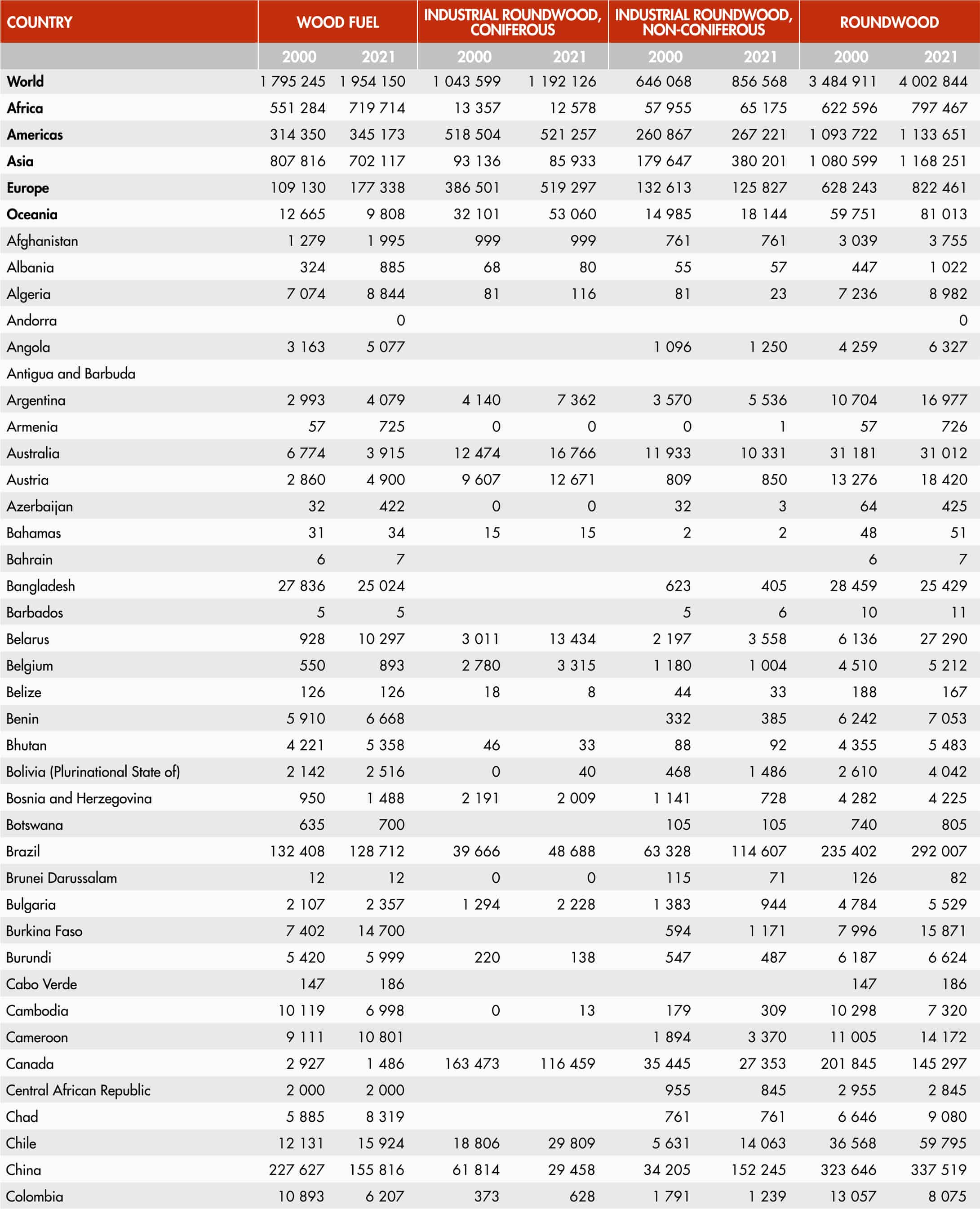 All roundwood felled or otherwise harvested and removed is comprised of all wood obtained from removals, i.e. the quantities removed from forests and from trees outside the forest, including wood recovered from natural, felling and logging losses during the period, calendar year or forest year. It includes all wood removed with or without bark, including wood removed in its round form, or split, roughly squared or in other form (e.g. branches, roots, stumps and burls, where these are harvested) and wood that is roughly shaped or pointed. It is an aggregate comprising wood fuel, including wood for charcoal and industrial roundwood (wood in the rough). It is reported in cubic metres solid volume underbark (i.e. excluding bark).