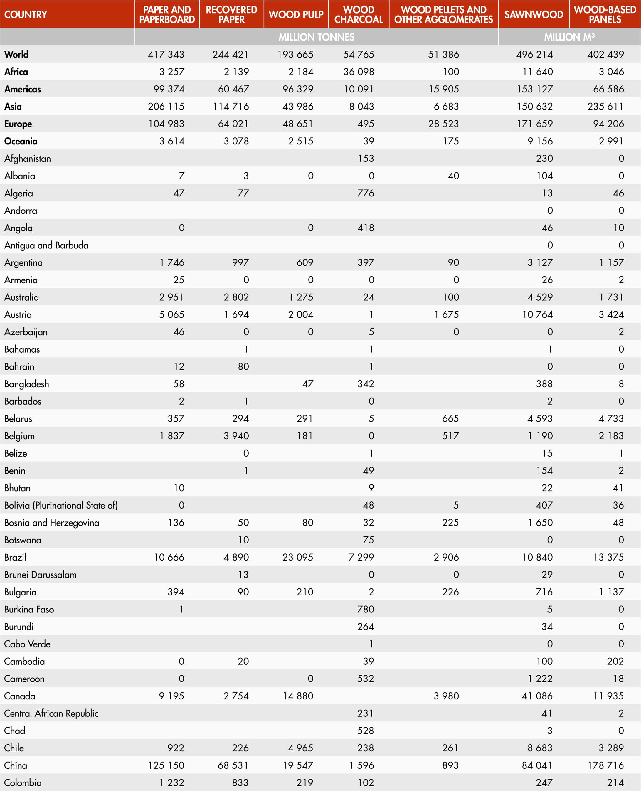 Forest product production includes the production of products that may immediately be consumed in the production of another product (e.g. wood pulp, which may immediately be converted into paper as part of a continuous process). This includes production from all sources within the country including public, private and informal sources. It excludes the production of veneer sheets that are used for plywood production within the same country. It is reported in cubic metres of solid volume in the case of roundwood, sawnwood and wood-based panels and metric tonnes in the case of charcoal, pulp and paper products.
