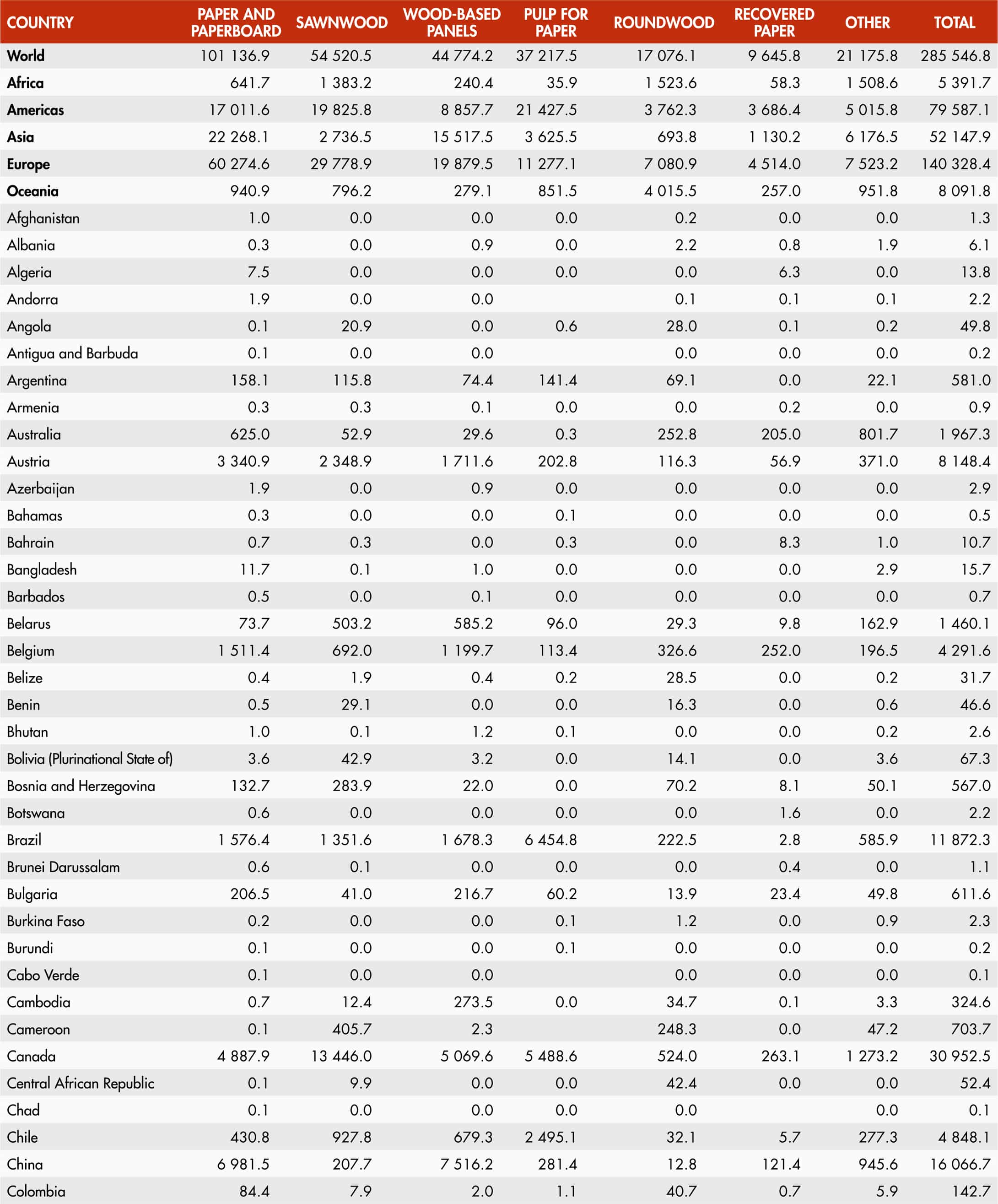 Products of domestic origin or manufacture shipped out of the country are forest product exports. They include exports from free economic zones and re-exports and exclude “in-transit” shipments. They are reported in cubic metres of solid volume or metric tonnes and values are normally recorded as FOB.