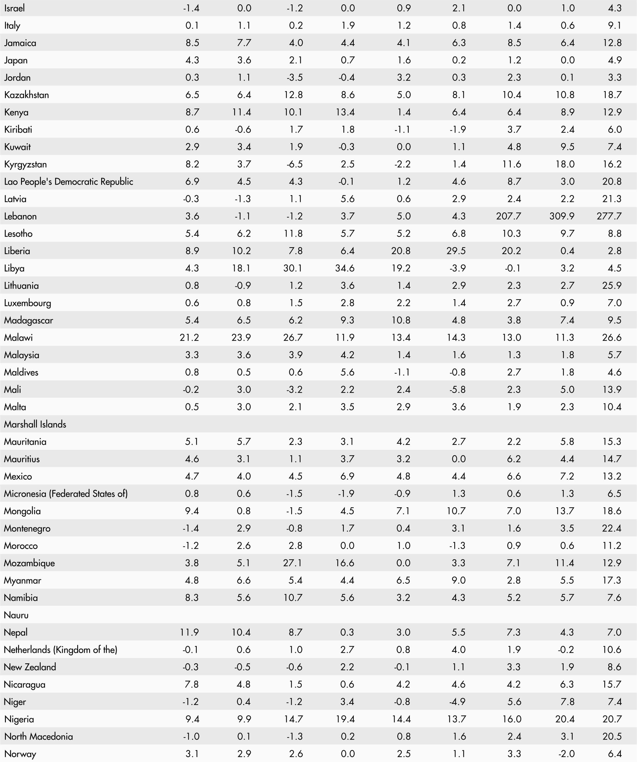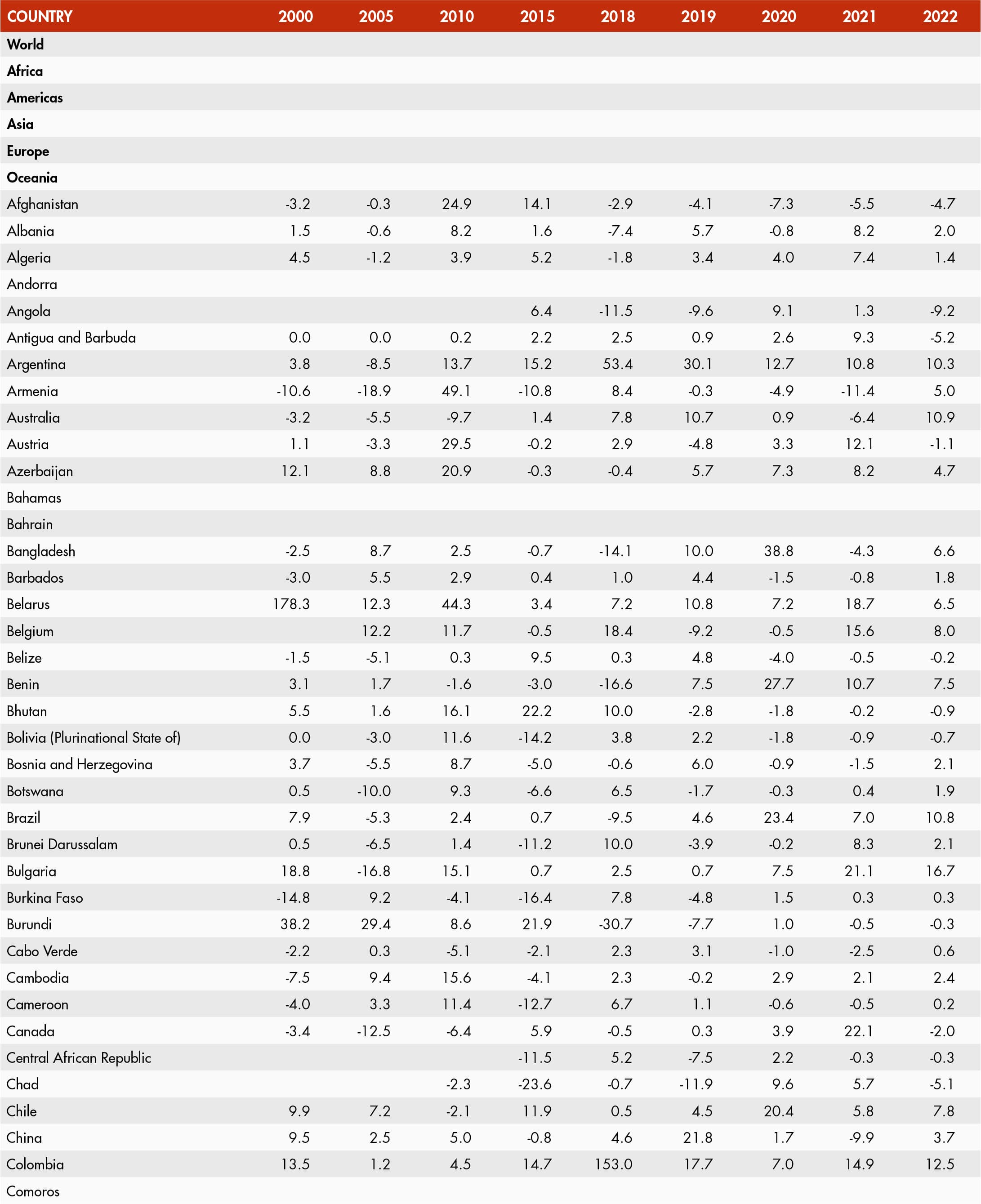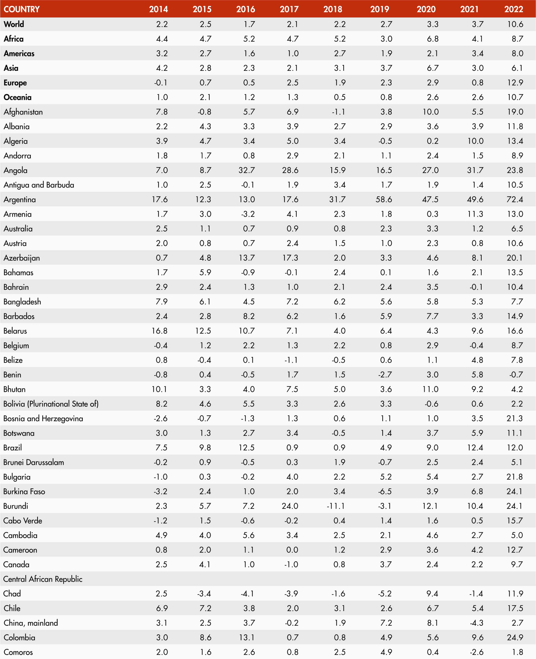The inflation rate of an index for any month refers to the percentage change in the index value for the month as compared to the index value of the corresponding month of the previous year. Global and regional food consumer price inflation measures food inflation for a group of countries at different geographical scales: Africa, Europe, Oceania, Latin America and the Caribbean, North America and Asia. Global and regional inflation are calculated using household consumption expenditure weights.