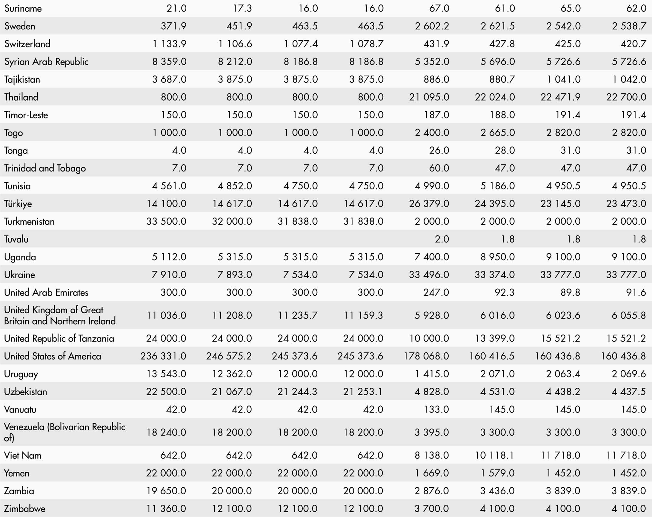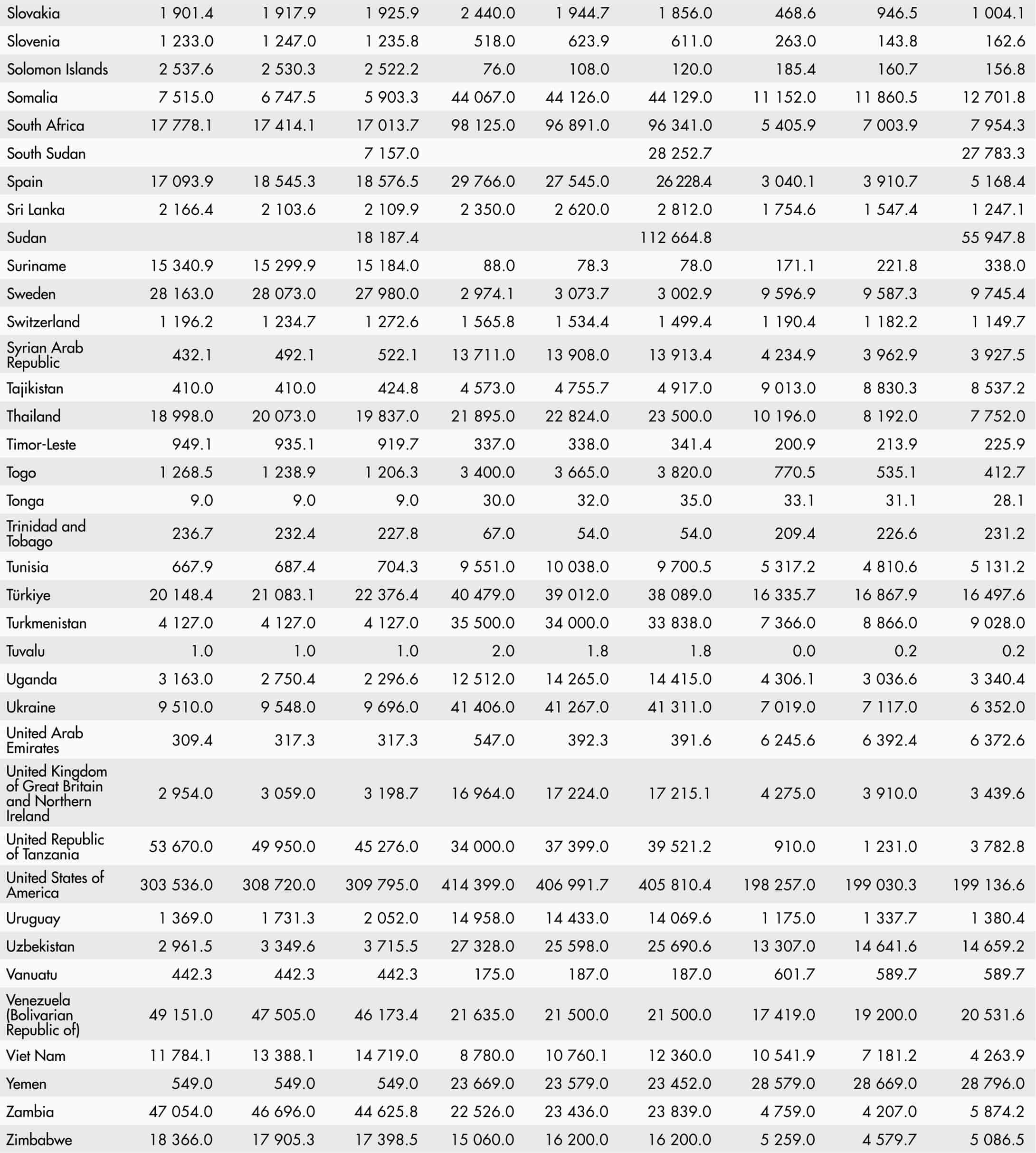 This Statistical Yearbook was prepared by the Statistics Division (ESS) of the Food and Agriculture Organization of the United Nations (FAO) in collaboration with the Communications (OCC), Fisheries and Aquaculture (NFI), Forestry (NFO), Land and Water (NSL) and Markets and Trade (EST) divisions. Olivier Lavagne d’Ortigue led the work under the direction of José Rosero Moncayo (ESS Director). We would like to thank the following for their contributions and input: Iana Arkhipova, Veronica Boero, Carlo Cafiero, Giulia Conchedda, Piero Conforti, Valentina Conti, Christophe Duhamel, Birkan Durak, Adrienne Egger, Tomasz Filipczuk, Laura Galeotti, Chiara Gnetti, Amanda Gordon, Leman Yonca Gürbüzer, Dominique Habimana, Anne Kepple, Irina Kovrova, Arvydas Lebedys, Eun Jeong Lee, Jeannie Marshall, Masakhwe Sharon Mayienga, Patricia Mejias Moreno, Jean-Marie Munyeshyaka, Griffiths Obli Laryea, Xueyao Pan, Giulia Piva, Kimberly Sullivan, Salar Tayyib, Francesco Tubiello, Monica Umena, Stefania Vannuccini, Sara Viviani, Michele Vollaro, Sven Walter, Nathan Wanner, Firas Yassin and Zehra Zaidi.
