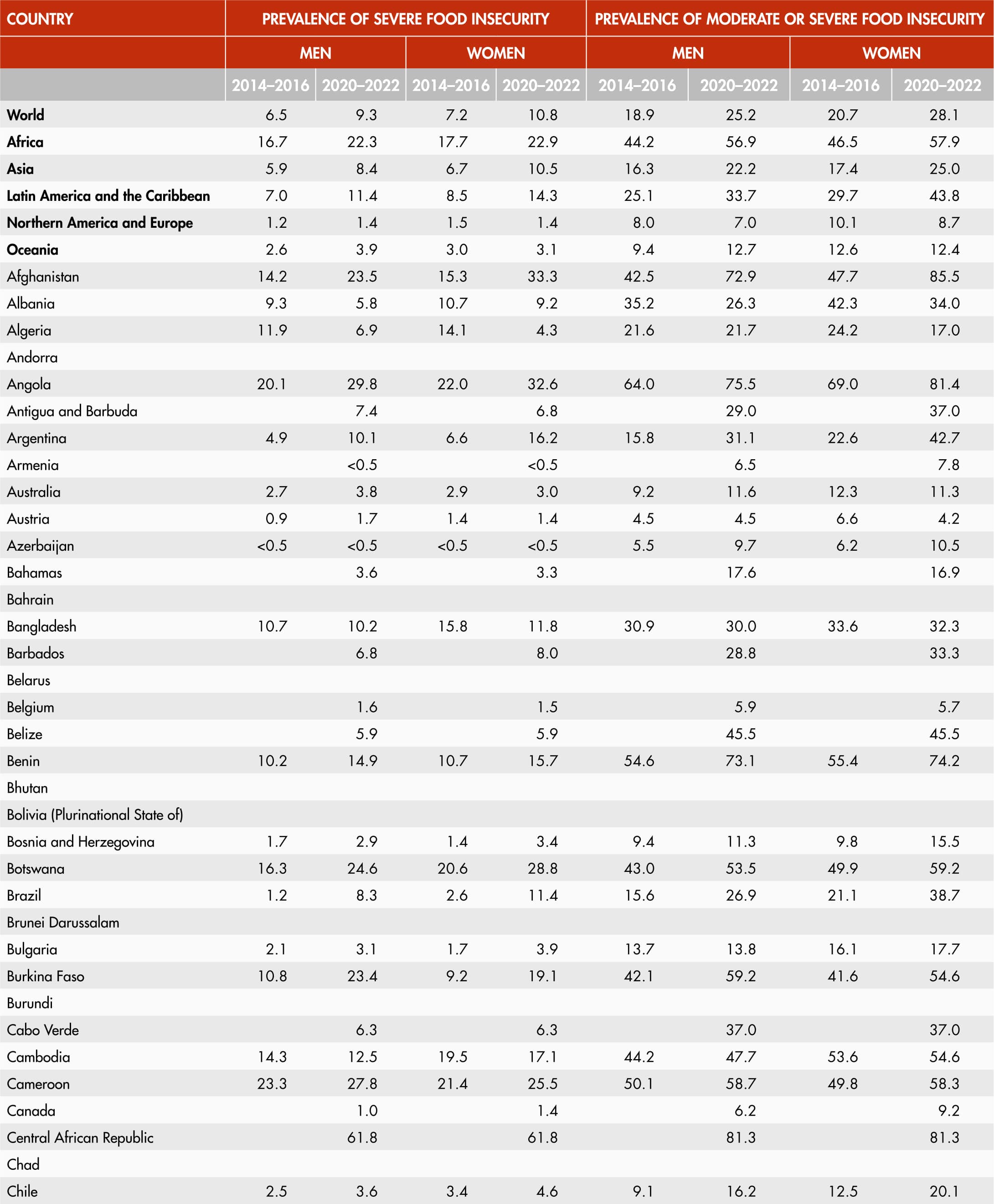 50. Food insecurity levels by region and sex (2022)