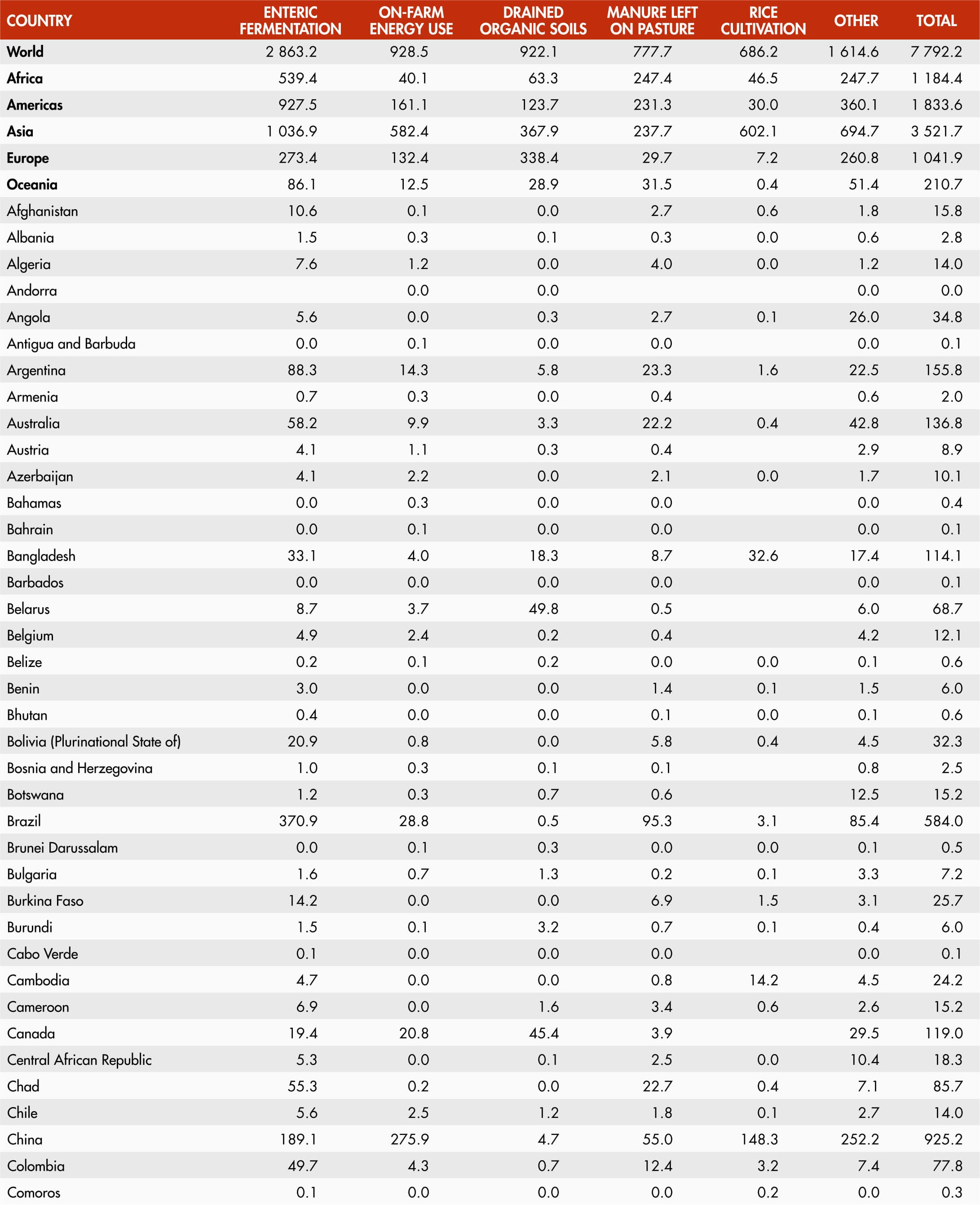 Farm-gate emissions cover all agricultural processes within farms related to crop and livestock production (enteric fermentation, manure management, rice cultivation, synthetic fertilizers, manure applied to soils, manure left on pastures, crop residues, drained organic soils, burning of crop residues, savanna fires), including energy use and drained organic soils within the farm. Non-CO2 gases, namely CH4 and N2O, are produced by crop and livestock production and management activities whereas CO2 emissions are produced from the drainage of organic soils and on-farm use of fossil-fuel based energy (including electricity and heat generated off farms). Emissions are computed following Tier 1 Intergovernmental Panel on Climate Change (IPCC) 2006 Guidelines for National GHG Inventories.