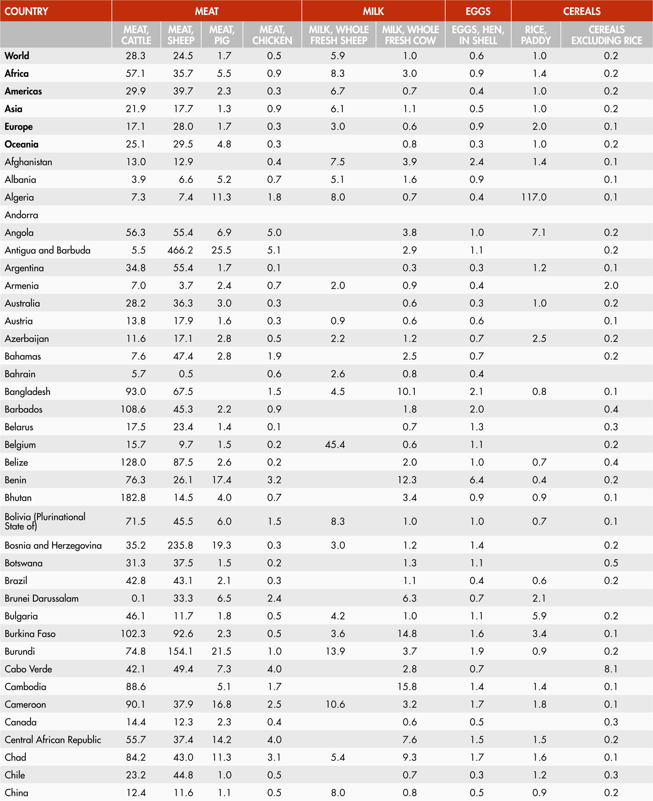 Greenhouse gas emissions within the farm gate per unit weight of product, expressed in kg CO2eq/kg of product. The indicator is computed for six types of meat (buffalo, cattle [beef], chicken, goat, pig and sheep), four types of milk (camel, cow, goat and sheep), hen eggs, rice, and other cereals (combining the intensities of barley, maize, millet, oats, rye, sorghum and wheat).