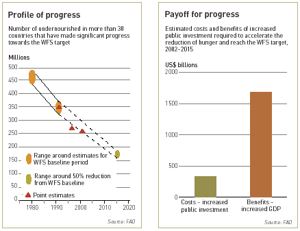 FAO's own estimates of the costs and benefits of action to accelerate progress towards the WFS goal suggest that US$24 billion a year in public investment, associated with additional private investment, would lead to a boost in annual GDP amounting to US$120 billion as a result of longer and healthier lives.