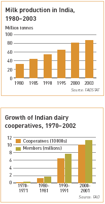 The key to smallholder dairy production and India's White Revolution has been the growth of a nationwide network of dairy cooperatives. The cooperative approach started successfully as a local initiative in Anand, Gujarat, half a century ago. Since 1970 it has been replicated all across India through a three-phase programme known as Operation Flood, backed by the Indian Government, the Anand Milk Union Limited, FAO and the World Bank. By 2002, more than 11.2 million households were participating in 101 000 village dairy cooperatives (see graph).