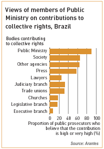 Judicial processes can be slow and expensive. In some countries, quasijudicial mechanisms are being used to claim the right to food. In Brazil, for example, public prosecutors in the Ministério Público (Public Ministry) can initiate civil suits against any person or entity, including government agencies, “for the protection of public and social patrimony, of the environment and of other diffuse and collective interests”. Since the 1988 Constitution broadened the scope for these “public civil suits”, public prosecutors have used them increasingly to press for rights such as the right to food that might be derived from the constitutional right to “education, health, work, leisure, security, social welfare, maternity protection and childhood”. Indeed a survey of attitudes among public prosecutors found that they believe the Public Ministry can contribute more than any other institution or sector to broadening and consolidating such “diffuse and collective rights” (see graph)