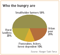 The Task Force has carried out research to identify more precisely who and where hungry people are. A set of maps highlights the world's “hunger hotspots” and has been used to help define general typologies of hunger. Based on available information, the Task Force has concluded that about half of the world's hungry people are from smallholder farming communities, another 20 percent are rural landless and about 10 percent live in communities whose livelihoods depend on herding, fishing or forest resources. The remaining 20 percent live in cities (see graph).
