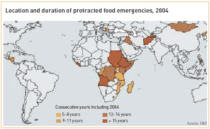 More than 45 million people were affected by the 21 most serious humanitarian crises in 2003. Most of these crises have persisted for many years, often triggered by armed conflict and compounded by drought, floods and the effects of the AIDS pandemic (see map). Protracted crises disrupt food production and undermine food security as they drive people from their homes, strike at the foundations of their livelihoods and erode the social fabric of families, communities and countries.