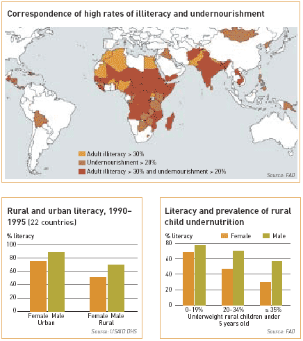 The vast majority of the world's 852 million chronically undernourished people live in rural areas in the developing world. So do most of the 860 million illiterate adults (a majority of whom are women) and the 130 million children (mainly girls) who do not go to school. The fact that hunger, illiteracy and lack of schooling affect many of the same areas and people is no coincidence. Nor does it merely reflect the fact that both hunger and lack of education are facets of extreme poverty. Hunger, malnutrition and food insecurity erode cognitive abilities and reduce school attendance. Conversely, illiteracy and lack of education reduce earning capacity and contribute directly to hunger and poverty.