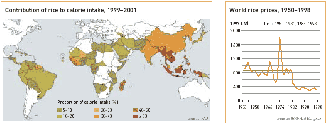 Rice is central to food security in the world. It is the main source of calorie intake for about half of the world's population and the predominant staple food for 34 countries in Asia, Latin America and Africa (see map). In several Asian countries, people depend on rice for more than two thirds of the calories and 60 percent of the protein in their diets.