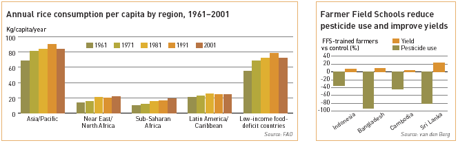 Technological advances can boost yields and government policies can help create a favourable environment for producing and marketing rice. But long-term success in improving food security depends on the ability of millions of small farmers to benefit from these gains and increase rice production as part of sustainable, diversified agricultural systems.
