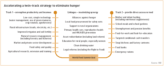 Although progress has lagged so far, the WFS target is both attainable and affordable. We have ample evidence that rapid progress can be made by applying a twin-track strategy that attacks both the causes and the consequences of extreme poverty and hunger (see diagram). Track one includes interventions to improve food availability and incomes for the poor by enhancing their productive activities. Track two features targeted programmes that give the most needy families direct and immediate access to food.