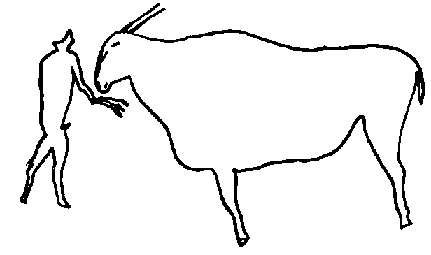 FIGURE 4. - Bushman rock painting of man feeding eland. This ancient record does not of course imply that the Bushmen were aware. of the. potentialities for domestication as we. understand them today but it scents likely that they well knew the ease with which eland can be tamed.