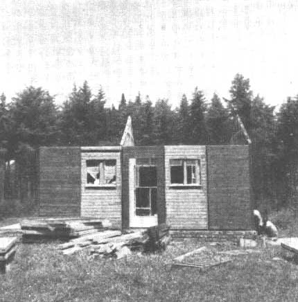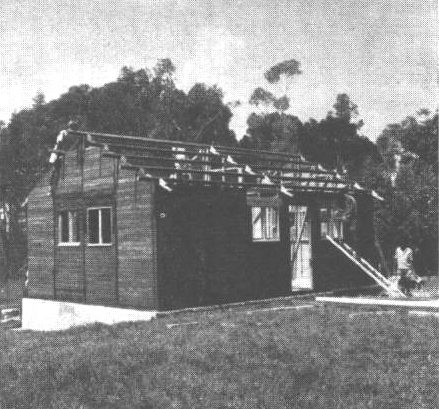 From the construction of the subfoundation (Figure 1), a cement slab 20 centimeters above ground level to obviate the danger of rot or decay and termites, to the erected building (Figure 6) took about 16 hours. The basic wall element is a panel 1.20 x 2.40 meters. The timber used was Cupressus lusitanica obtained by thinning a 23-year old plantation. The wood was ripsawn into boards and then rough-planed.