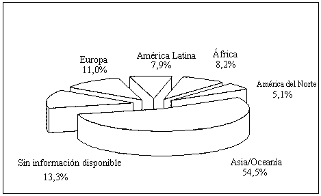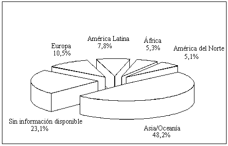 Mundialmente, al menos 99 países tenían reglamentos para las micotoxinas1 en los alimentos y/o en las raciones en el año 2003 (ver la Figura 1), un aumento de aproximadamente 30 por ciento comparado con 1995. La población total en estos países representa aproximadamente 87 por ciento de los habitantes del globo. La Figura 2 muestra la proporción de la población mundial que vive en regiones con reglamentos vigentes para las micotoxinas en 1995 y en el año 2003. En 1995, el 23 por ciento de la población mundial vivía en una región en la que no estaba vigente ningún reglamento conocido para las micotoxinas. Este porcentaje había disminuido al 13 por ciento en el año 2003, en razón de un ligero aumento en América Latina y Europa e incrementos más significativos en África y Asia/Oceanía.