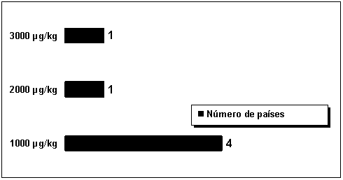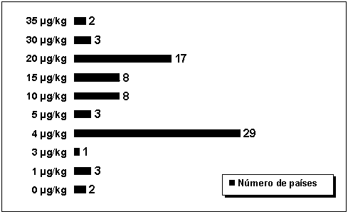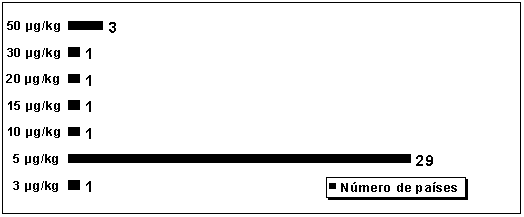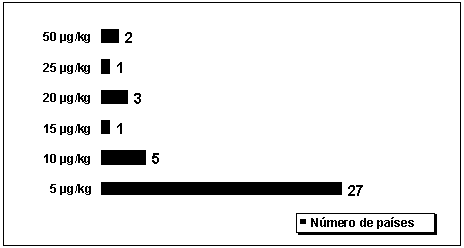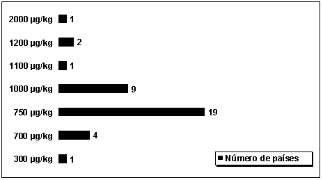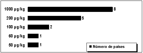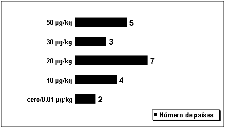 Igual que en 1995, en el año 2003 muchos países reglamentaron las aflatoxinas con límites para la suma de las aflatoxinas B1, B2, G1, y G2, a veces de manera combinada con un límite especifico para la aflatoxina B1. El intervalo de los límites (0-35 mg/kg) se he reducido ligeramente comparado con el del año 1995, en tanto que el límite mediano (10 mg/kg) es ligeramente superior. El límite que aparece con mayor frecuencia (ver Figura 14) es de 4 mg/kg (aplicado por 29 países), un límite encontrado nuevamente en los reglamentos armonizados en la UE, la AELC y en los países candidatos a incorporarse a la UE donde están vigentes límites dobles tanto para la aflatoxina B1 como para las aflatoxinas totales. Otro pico importante aparece en los 20 mg/kg, aplicado por 17 países, la mitad de ellos en América Latina (donde existe también un límite armonizado en el MERCOSUR) y en varios países del África. También los Estados Unidos, uno de los primeros en fijar un límite de acción para las aflatoxinas, se rigen por el valor de 20 mg/kg. Durante los años ha persistido la popularidad del límite para las aflatoxinas totales en los alimentos, con el resultado de que 76 países en el año 2003 aplican este nivel (comparado con 61 países con un límite especifico para la aflatoxina B1).