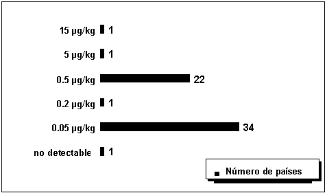 A fines del año 2003 existían reglamentaciones para la aflatoxina M1 en 60 países, un incremento superior a las tres veces comparado con el año 1995. Nuevamente son la UE, la AELC y los países candidatos a incorporarse a la UE los que contribuyen mayoritariamente al pico más significativo indicado en la Figura 16 de 0,05 mg/kg, aunque otros países en el África, Asia y América Latina aplican también este límite. Otro límite significativo aparece con 0,5 mg/kg. Este límite superior se aplica en los Estados Unidos, varios países asiáticos y europeos, aunque con más frecuencia aparece en América Latina donde ha sido fijado también como un límite armonizado en el MERCOSUR.