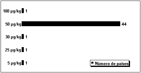 Son muchos los países que desde 1995 han reglamentado la patulina principalmente en productos de frutas, como el jugo de manzana. La gran mayoría de los países con reglamentos o valores guía para la patulina en los alimentos han adoptado el mismo nivel de 50 mg/kg ilustrado en la Figura 19. Recientemente, en la UE, entraron en vigencia límites armonizados para la patulina en diferentes productos (Comisión Europea, 2003a), que la convierten en una de las micotoxinas más reglamentadas del mundo.