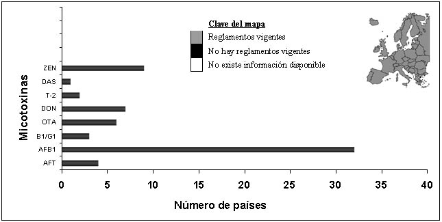 En Europa, 39 países, representando aproximadamente el 99 por ciento de la población del continente, cantaban con reglamentos específicos para micotoxinas en el año 2003. Las Figuras 7 y 8 ilustran, respectivamente, la presencia de límites reglamentarios para diversas las micotoxinas en Europa en los alimentos y en las raciones.