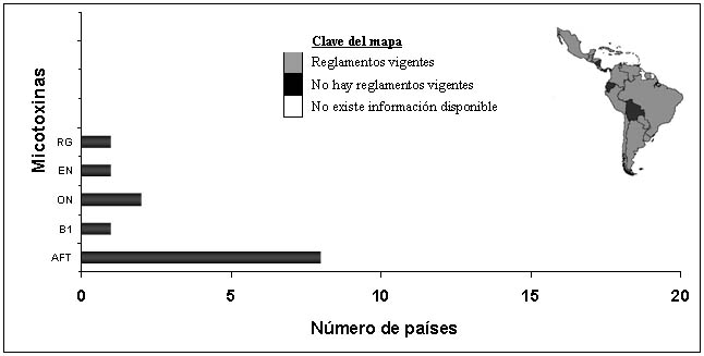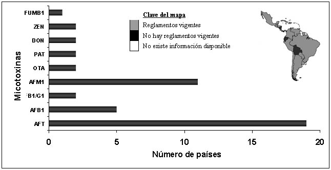 Los principales cultivos agrícolas de América Latina (maíz, trigo, café, algodón, soja, cebada, girasol, maníes y nueces de árbol, cocoa y lácteos) son muy susceptibles a la contaminación con hongos y proclives a producir micotoxinas (Piñeiro, 2004). Las Figuras 9 y 10 muestran los límites reglamentarios respectivos para diversas micotoxinas en América Latina en los alimentos y en las raciones. Se sabe que 19 países, que representan el 91 por ciento de la población de la región, cuentan con reglamentaciones específicas sobre micotoxinas. En el MERCOSUR, un bloque comercial integrado por Argentina, Brasil, Paraguay y Uruguay existen reglamentos armonizados para las aflatoxinas (ver también la Sección 3.5.3). Otros países indican que siguen también los reglamentos del MERCOSUR. Los reglamentos para aflatoxinas en los alimentos son a menudo fijados para el total de las aflatoxinas B1, B2, G1 y G2. El Uruguay cuenta con las reglamentaciones más detalladas, incluyendo límites para los alcaloides del ergot en las raciones, algo muy raro en el mundo de los reglamentos para las micotoxinas.