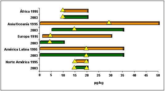 La Figura 15 muestra los rangos y medianas de los límites para las aflatoxinas totales para diversas zonas del mundo en los alimentos para los años 1995 y 2003. No parecen haberse registrado cambios observables en el África, América Latina y América del Norte; en cambio en Asia/Oceanía y en Europa se aprecia una tendencia a valores más bajos para los límites de las aflatoxinas totales.