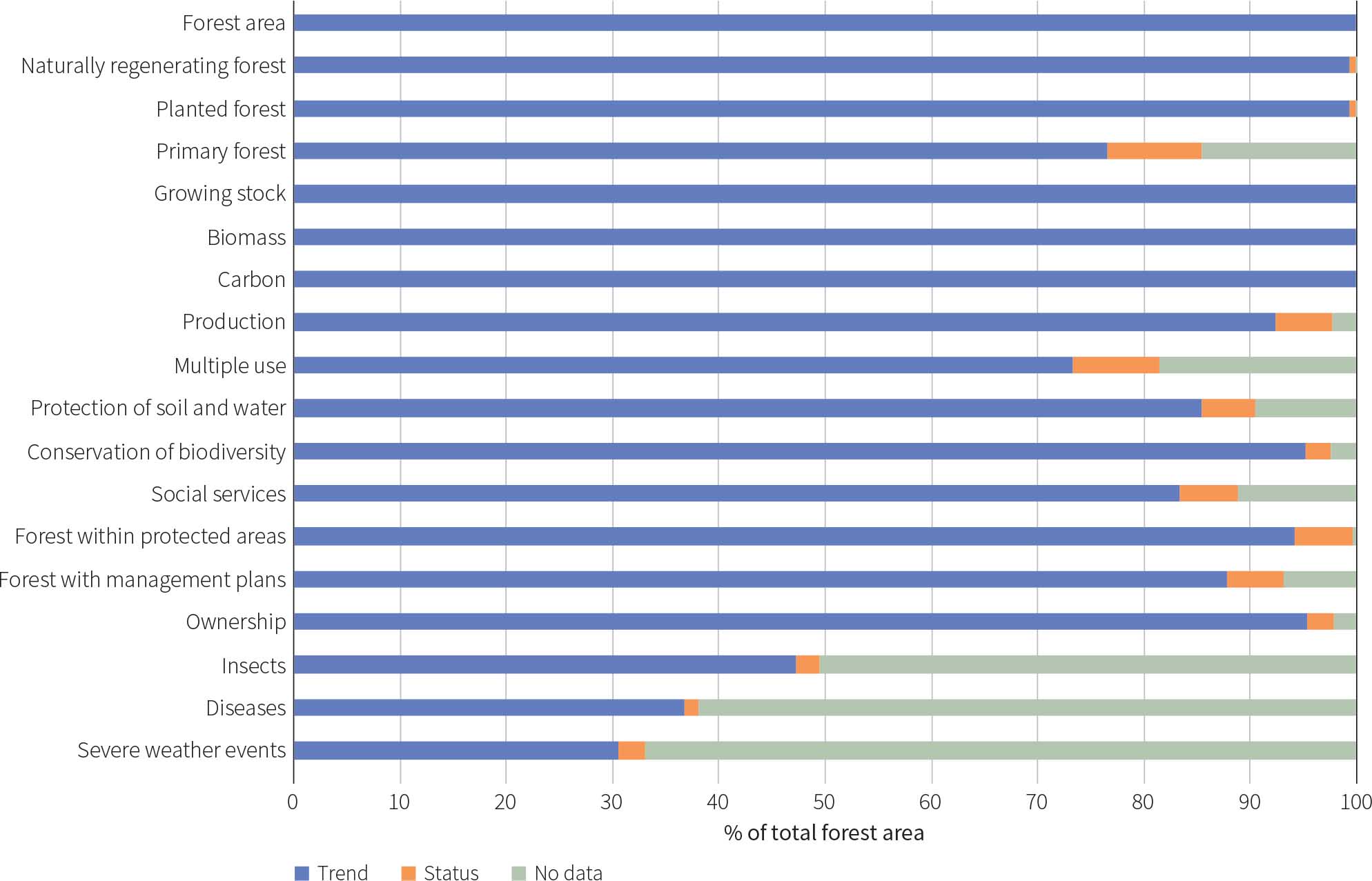 The response frequency of countries and areas for FRA 2025 was generally very good, and data availability for key variables is high. The number of reporting countries and areas increased for all variables compared with FRA 2020. Of the 18 variables shown in Figure 62,18 the global forest area represented by reporting countries and areas exceeded 90 percent for 11 variables reporting on status. The reporting on trends in forest area exceeded 90 percent for ten of the 18 variables. The lowest data availability was for insects, diseases and severe weather events, with the countries and areas reporting on these factors representing less than half the global forest area.