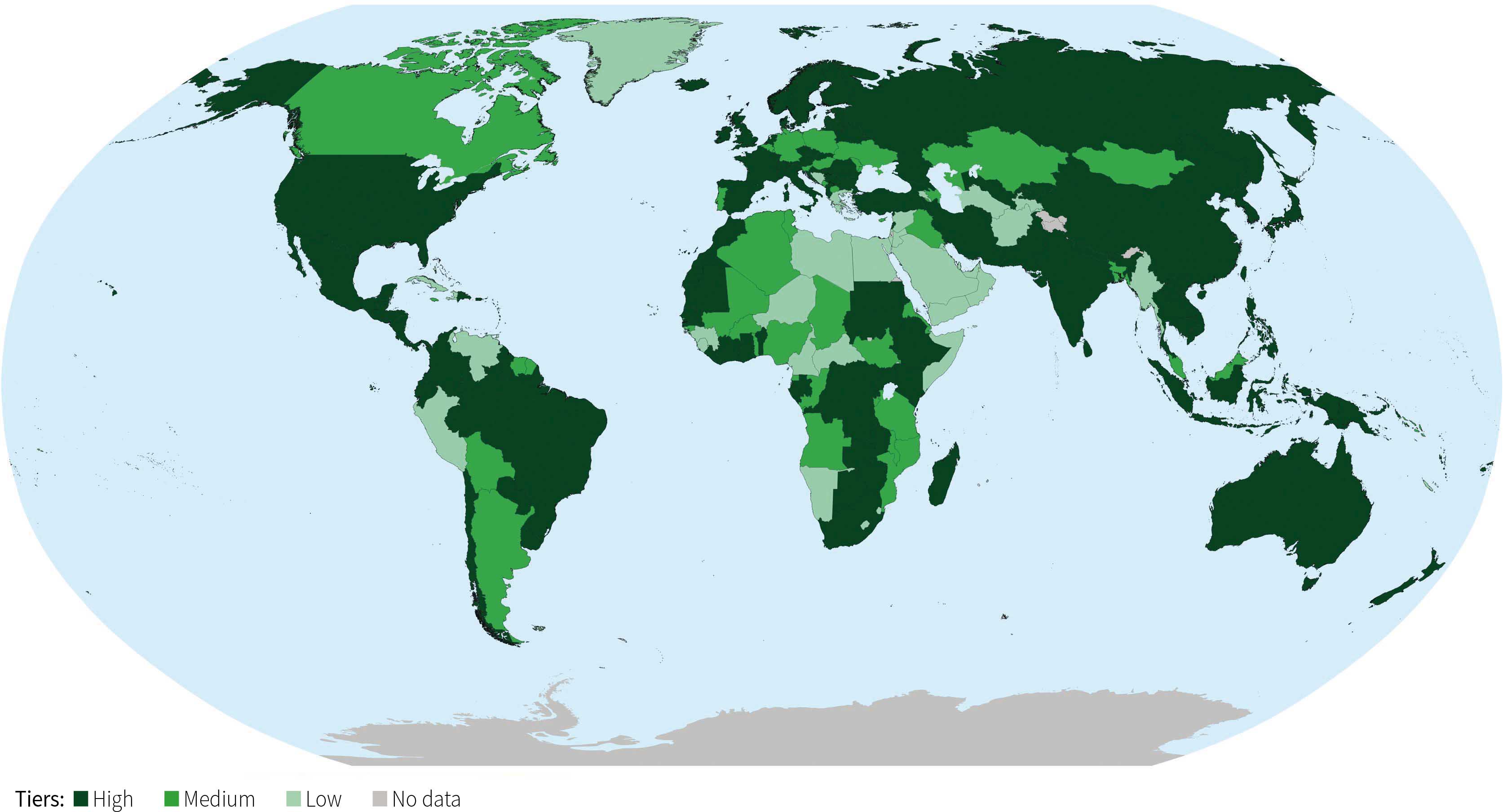 Eighty-eight countries representing more than half (52 percent) of the world’s forest area based their trend estimates on repeated compatible national forest inventories, of which the most recent was not older than five years, and/or remote-sensing change assessments using multitemporal analysis for a period ending not more than five years before the date of submission (high tier). Fifty-six countries representing 41 percent of the global forest area reported that their trend estimates were in the medium tier of accuracy, and the remaining 92 countries (representing 7 percent of the total forest area) estimated forest-area trends based on expert opinion or incompatible datasets (i.e. the low tier) (Figure 64).