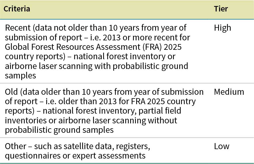 A comparison with FRA 2020 indicates a significant improvement in reporting coverage for FRA 2025, with an increase in both the number of countries and areas reporting on growing stock (from 183 in FRA 2020 to 216 in FRA 2025) and in the forest area represented across all growing-stock variables. Nevertheless, the tier analysis also shows that both the number of reporting countries and areas and the proportion of forest area assessed as high-tier declined in FRA 2025 compared with FRA 2020. Unlike in FRA 2020, the tier assessment for FRA 2025 was carried out directly by the reporting countries and areas. Further analysis is required to determine whether the apparent decline reflects this change (or other changes) in the tier assessment methodology or an actual negative trend in the quality of data sources for growing-stock assessment, such as a lack of updates of national forest inventories.