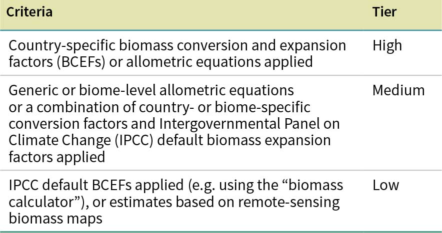 A three-class tier system was applied by countries and areas to evaluate the quality of data used for reporting on biomass (Table 91). In 2025, 28 percent of countries and areas representing nearly two-thirds of the forest area used high-tier data for biomass reporting. High-tier coverage was most prevalent in Europe and least prevalent in Africa (Figure 66).