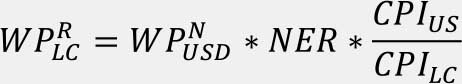حيث يشير WP إلى السعر العالمي للسلعة المختارة وLC إلى العملة المحلية، وR إلى القيمة الحقيقية (معدلة لمراعاة التضخّم)، وN إلى القيمة الاسمية، وNER إلى سعر الصرف الاسمي الثنائي مقابل الدولار الأمريكي في البلد المعني، بينما يمثل CPIUS/CPILC النسبة بين مؤشر أسعار الاستهلاك في الولايات المتحدة ومؤشر أسعار الاستهلاك في البلد. ويُعبّر بعد ذلك عن الصيغة بالقيمة النسبية على النحو التالي: