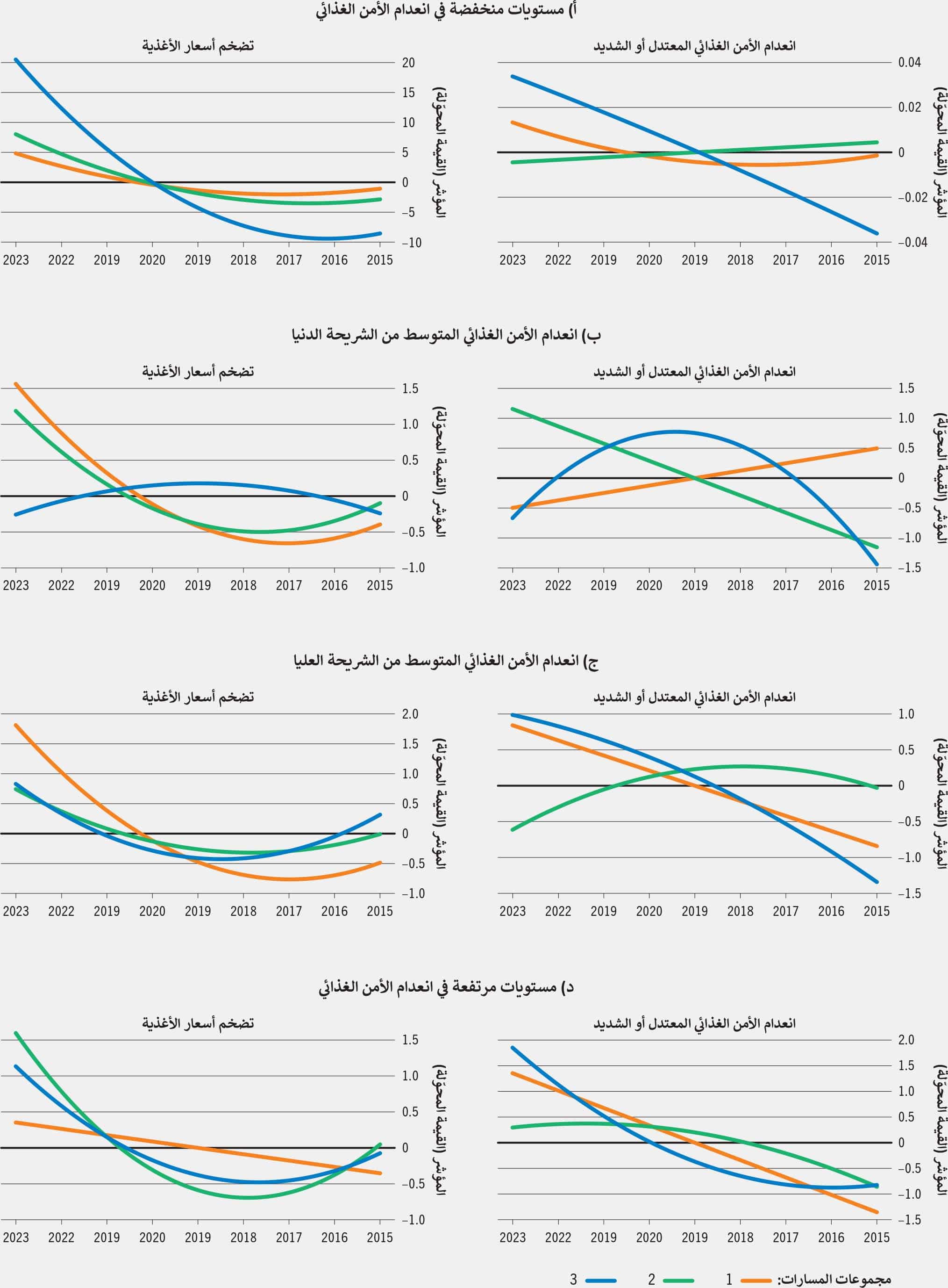 وقد ظهرت عبر جميع فئات خط الأساس الأربع ثلاثة أنماط من المسارات المتسقة التي تتسم بعلاقات مميزة بين التضخم والأمن الغذائي. ويظهر النمط الأول تغيرًا طفيفًا في الأمن الغذائي، رغم زيادات تراوحت بين معتدلة وشديدة في تضخم أسعار الأغذية. ويظهر النمط الثاني تدهورًا في الأمن الغذائي مصحوبًا بمستويات متفاوتة من التضخم في أسعار الأغذية، مما يدل على وجود تحديات. أما النمط الثالث فيظهر ديناميكيّات فريدة تختلف باختلاف كل مجموعة أساسية، وتتراوح بين التدهور الشديد والتحسن الكبير في الأمن الغذائي، على الرغم من ضغوط التضخم في أسعار الأغذية. وتراوحت معاملات الارتباط بين التضخم في أسعار الأغذية وانعدام الأمن الغذائي بين الإيجابية (0.58) والسلبية (-0.45) عبر هذه المجموعات.126