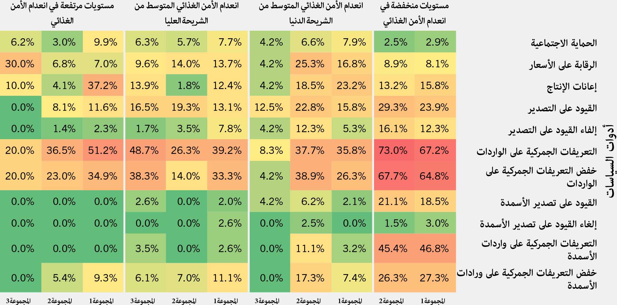 ومن بين البلدان التي تواجه تضخمًا كبيرًا في أسعار الأغذية وتدهورًا في الأمن الغذائي، كان مزيج السياسات الأكثر شيوعًا هو دعم المدخلات الزراعية من دون تدخلات مصاحبة في مخزونات الأغذية (الرفع: 1.44؛ الثقة:68 في المائة). وتشير هذه الأنماط إلى أن النهج التي تركز على التجارة، عندما لا تُستكمل بنظم حماية اجتماعية كافية، ترتبط بنتائج أقل إيجابية في حالة الأمن الغذائي في السياقات التي تتسم بمستويات معتدلة من انعدام الأمن الغذائي.