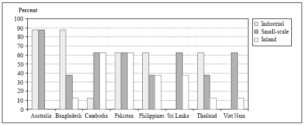 Of ten countries that responded, eight were able to give estimates of the proportion of their fisheries that had been the subject of capacity assessment. The results are shown in Table 1 and Figure 1. From these limited figures, it appears that attention has generally been paid to the assessment of fishing capacity in industrial fisheries (where they exist) with capacity having been assessed in an average of 62.5 percent of major industrial fisheries in the respondent's countries. Although progress has generally been made since 2002 (see above), artisanal fisheries have received the most attention in recent years (see below), although capacity has still been assessed in only 54.7 percent of major artisanal fisheries. Inland fisheries have not received very much attention at all with fishing capacity having been assessed in only 33.1 percent of major inland fisheries. In 2002, countries3 reported that they had a process for measuring fishing capacity in 71 percent of their three largest industrial fisheries although fishing capacity was measured in only 33 percent of the three largest small-scale artisanal fisheries. While there was no data collected for inland fisheries during the 2002 survey, capacity measurement may be difficult in many inland fisheries of the region4.