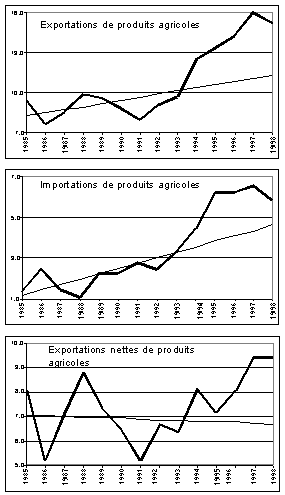 De 1985 à 1994, les exportations agricoles totales ont augmenté au taux linéaire de 235 millions de dollars E.-U. par an, et ont même progressé davantage dès 1995 (Figure 1). Leur valeur moyenne de 1995 à 1998 (14,7 milliards de dollars E.-U.) était supérieure de 53 pour cent aux résultats de la période 1990-94 et de 34 pour cent à la valeur tendancielle extrapolée (tableau 8). De 1985 à 1994, les importations agricoles ont aussi nettement augmenté et se sont maintenues à ces niveaux par la suite. Leur valeur moyenne de 1995 à 1998 était de 105 pour cent supérieure au niveau de la période 1990-94 et de 48 pour cent supérieure à la valeur tendancielle extrapolée. Le Brésil dispose d'importants excédents agricoles, qui atteignent quelque 8,5 milliards de dollars E.-U. en 1995-98 (les importations représentent seulement 35 pour cent des exportations).