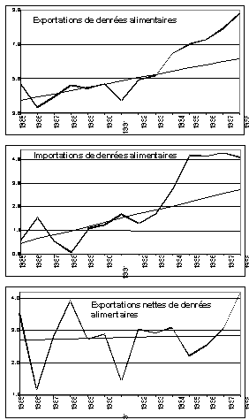 Figure 2: Echanges de produits alimentaires, de 1985 à 1998, en milliards de dollars E.-U. (en gras, les valeurs réelles; en fin, les tendances pour 1985-94, extrapolées jusqu'en 1998)