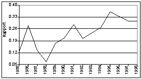 La figure 3 montre les variations annuelles des importations alimentaires par rapport aux exportations agricoles totales. Le taux a subi d'importantes fluctuations au cours du temps, la tendance ayant été positive de 1985 à 1994. De 1995 à 1998, le rapport était de 0,32, soit 36 pour cent de plus qu'au cours de la période 1990-1994 et de 15 pour cent de plus que la valeur tendancielle extrapolée, ce qui indique que le taux a reculé aussi par rapport à la tendance.