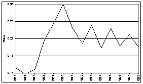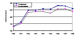Les importations alimentaires en 1995-98 ont également augmenté très nettement en 1990-94 (41 pour cent). Comme la tendance a été fortement positive, il n'y a pas eu de différence entre la valeur actuelle de 1995-98 et la valeur extrapolée pour cette période. Les exportations nettes pour la période 1995-98 ont été supérieures de 60 pour cent au niveau de 1990-94 et de 24 pour cent à la valeur tendancielle.